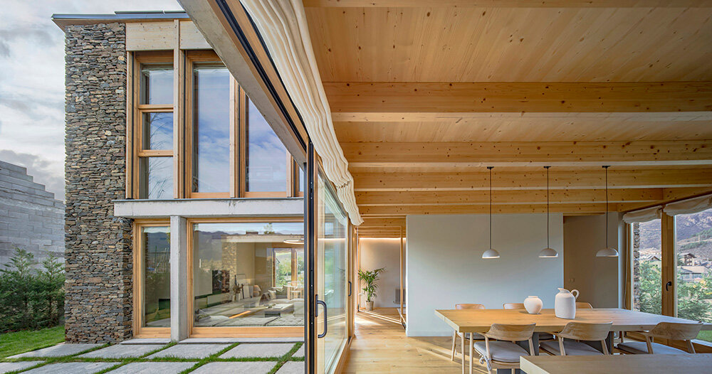 Las características de diseño diseñadas por Sau Taller d’Arquitectura para Bellvermásmateu son una forma compacta y sólida que recuerda a las personas el prototipo de la casa de montaña. este arquitecto Use techos de pizarra de inclinación simples y abertura vertical, y use materiales tradicionales (como la piedra Llívia y la madera prensada por capa) para complementar su entorno natural.