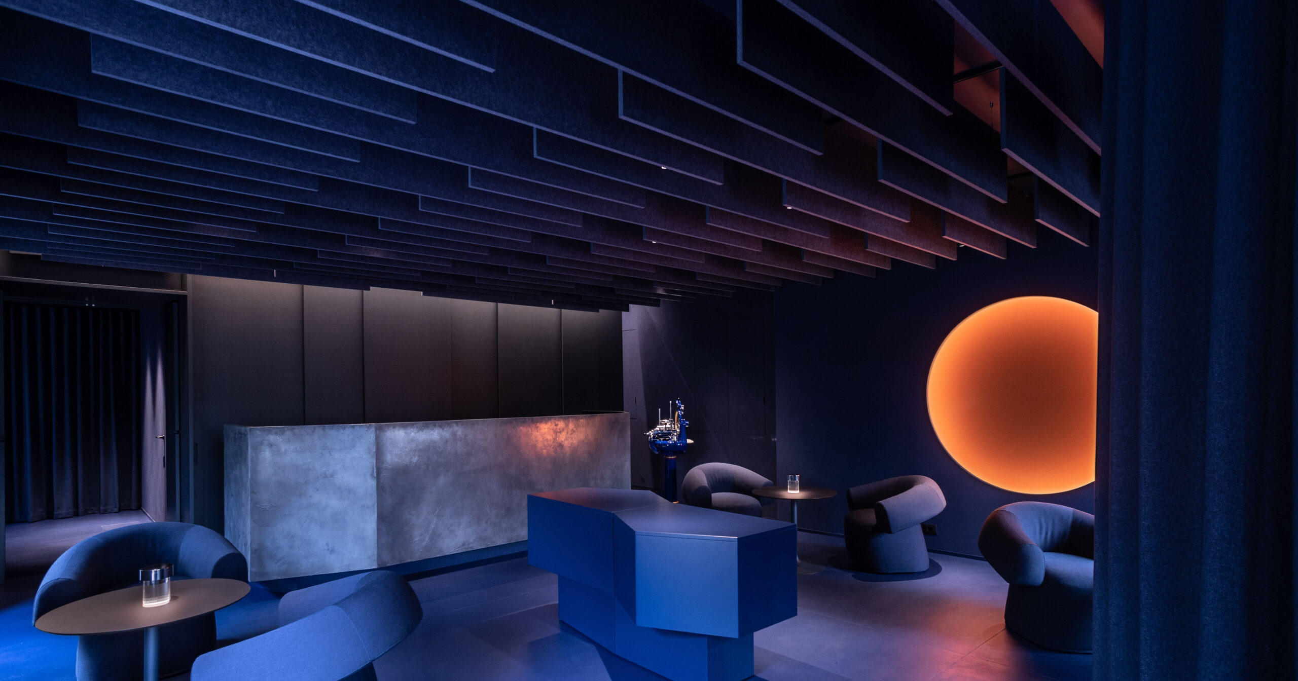 Le Studio entró en el mismo significado del drama. Las cortinas rojas oscuras se extienden en la barra, tragan el sonido, absorben la luz y esperan algo como un traje de escenario. La iluminación aquí es intencional y siente el rendimiento. El círculo está suspendido en los estratos circulares de decoración y direccionalidad. La tira en sí, que usa la cresta vertical roja, hace que la concha se sienta en alto, atraiga los ojos hacia adentro, y el área original de concreto y asiento negro producirá un contraste audaz y una oscuridad suficiente, lo que te hace darte cuenta de cómo la luz afecta la esencia del espacio.