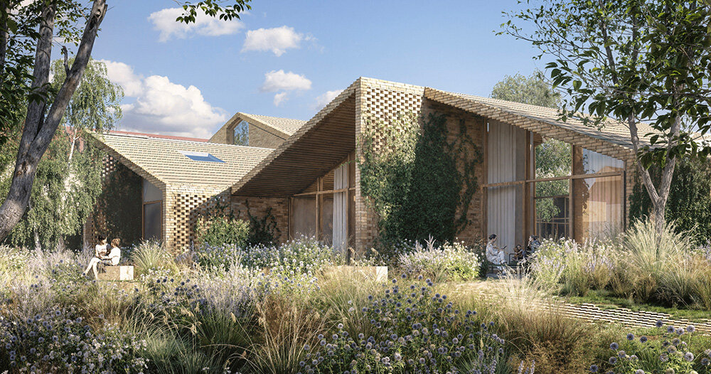 El diseño utiliza ladrillos amarillos reutilizados y techos lanzados para hacer eco de la estructura histórica