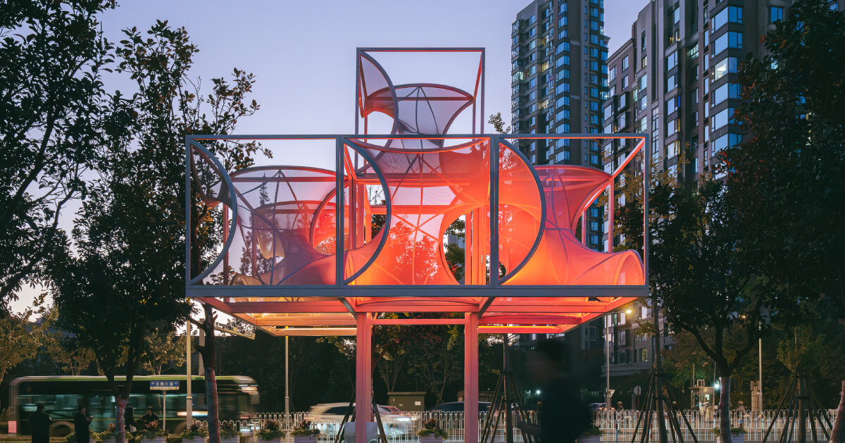 forma de estiramiento orgánico yuxtapuesto con perfil geométrico, Oficina de construcción de personas Cubitos rizados Instalar Reactivar De Shanghai Frente al mar para aumentar el compromiso social. La estructura es Modular Y una película curva adaptable y estirada, concebida por Serge Ferrari en un marco cuadrado liviano.