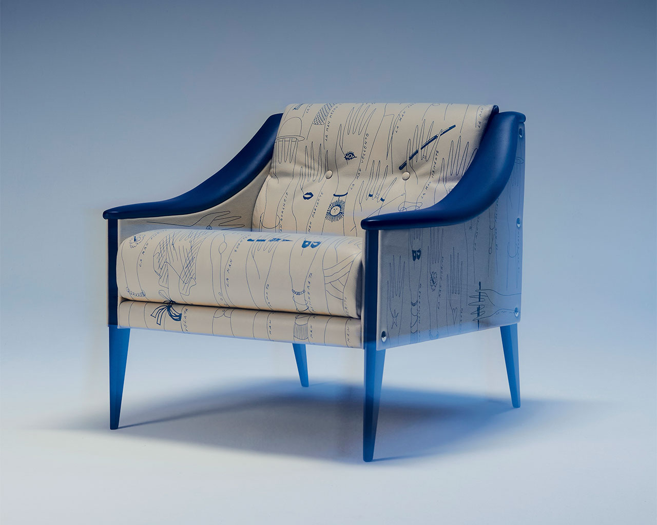 Las sombras de Panna y el brillante iris azul de Iris evocan los interiores aireados y alegres cuidadosamente elaborados para el Hotel Parco Dei Principi en Sorrento, con tonos similares. Sin embargo, la característica más única en esta versión es el patrón decorativo interior del torso interior. Irradia una réplica de ilustraciones previamente no publicadas del trabajo de Ponti, y la capacidad de Poltrona Frau de usar el proceso exclusivo para comprar en cuero e imprimirlo digitalmente en cuero, lo que se suma a la rica leyenda del proyecto. El patrón encantador consta de 26 manos estilizadas, cada una con su propio nombre e identidad, como «Glove Hand», «Star Hand», «Piercing Hand» y «Wealth Teller’s Hand», etc. En resumen, Dezza con expresiones juguetones y exquisitas y el dominio de los artesanos expresivos y la «sabiduría» inherente a la construcción de asientos.