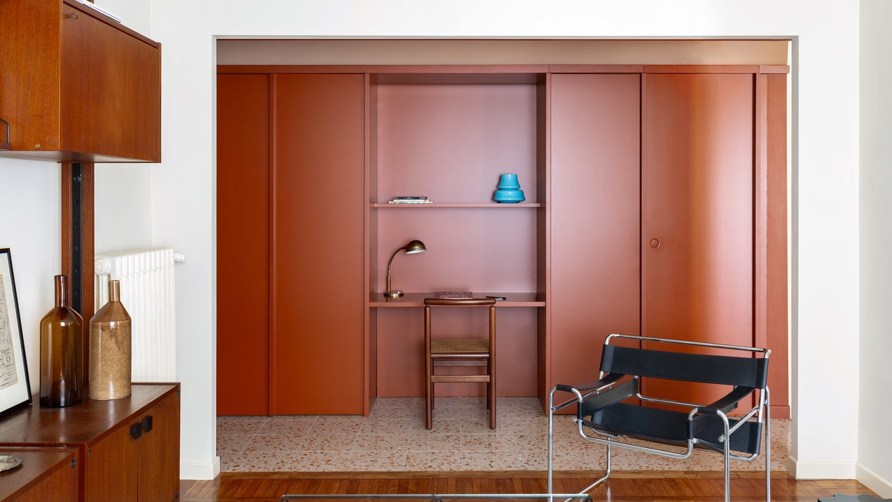 Largo y estrecho sala En cualquier familia, también puede ser un desafío, o en manos de la compañía adecuada, un protagonista de estilo. Este apartamento de 1.023 pies cuadrados se encuentra en el vecindario Città Studi de Milán, un edificio típico de principios del siglo XX. Cuando descubrieron este automóvil de residencia, su joven dueño seguía siendo un recién llegado a la ciudad, que conservó muchos elementos de época interesantes, incluidos pisos de parquet en dos habitaciones y baldosas de cemento vintage con un diseño clásico. Sin embargo, el principal desafío para la casa es el corredor. «El cliente no está seguro de qué hacer, pero inmediatamente decidimos que no podemos ignorarlo. Patada estudio.