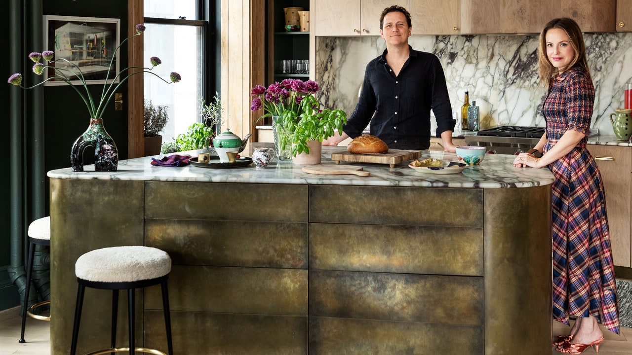 Finalmente, apartamento – Atraer juntos: Studio DB Architecture and Interior (Rizzoli, marzo de 2025),,,,, La nueva monografía de la compañía: le permite a la pareja probar ideas de diseño audaces, al igual que el padre de Damian. Para establecer un tono privado a la llegada, agregaron una pared para crear un vestíbulo adecuado y cubrieron el armario incorporado con papel tapiz de Carlico, cubierto con murales de plantas y pintaban la habitación de verde oscuro. Los clientes no siempre son tan adecuados para paletas oscuras, pero la pareja no lo ve como una barrera para la ventilación, trayendo colores a la espaciosa sala de estar. Para la cocina, diseñaron una isla con tapa de mármol de forma irregular y una base de latón pulido que ilustra los muebles. Tomó cuatro muestras de metal antes de establecerse en pátina.