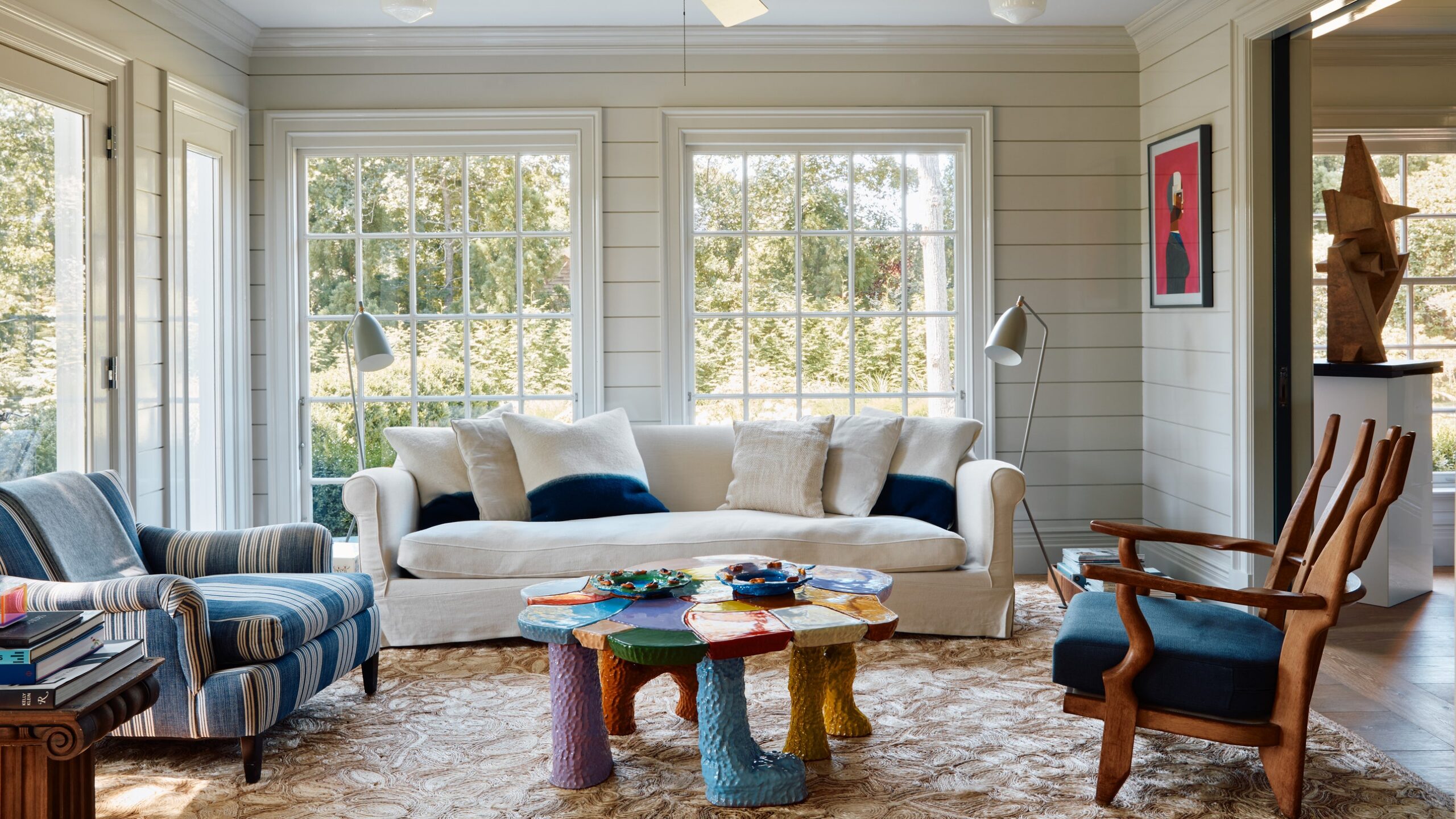 Pero la tradición no alcanza 3200 pies cuadrados de justicia familiar de cinco dormitorios. Si bien el aspecto blanco de estilo clásico no ha cambiado, ahora oscurece sorpresas agradables en el interior, como la elegante mesa de café de cerámica de color arco iris sean Gerstley, Derrick Adams y el trabajo significativo de Douglass de Douglas Pendleton, un bulbo de lámpara de araña Led hecho de un Old Burnt-Uuter y una silla de dedo de Guillerme y Chambron de Guillerme y vintage. La mayoría de las habitaciones están abiertas al exterior y se abieren entre sí en la planta baja. «Tenemos una habitación que es básicamente una bañera», dijo Alexia en su parte favorita de la casa.