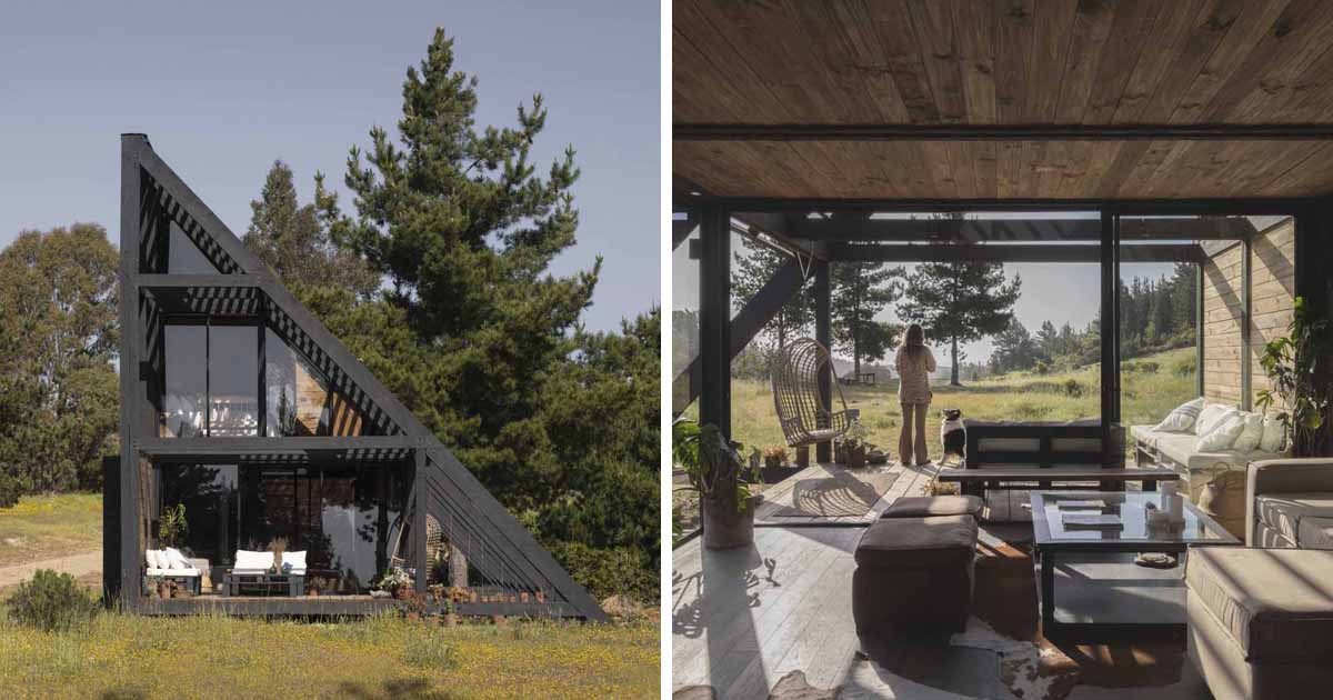 Una pequeña casa en forma de cuña con una apariencia negra, ubicada en la ventosa playa de Matanzas, Chile.
