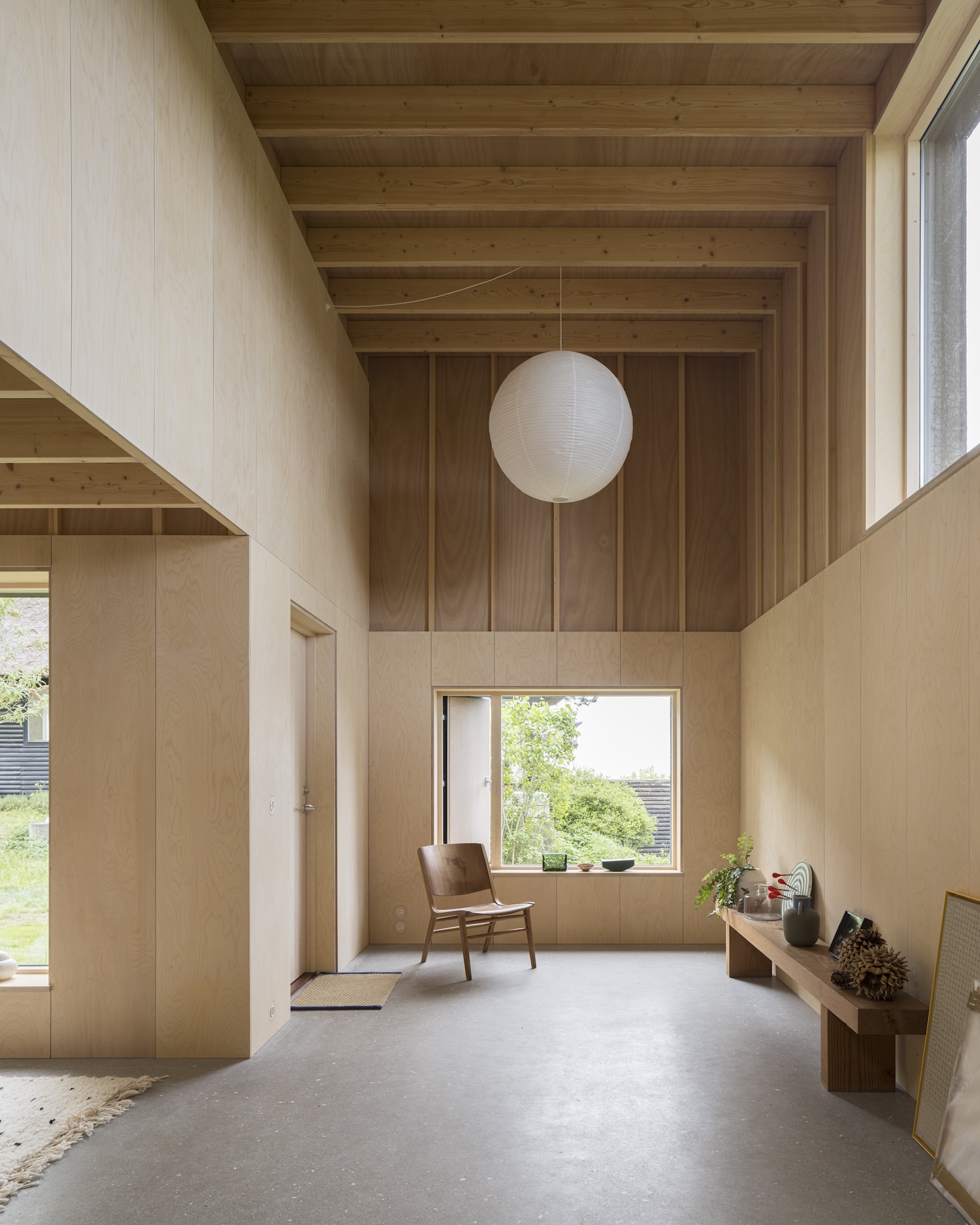 Lo que hace que el proyecto sea particularmente notable es su compleja manipulación de escala y orden. Estos cuatro volúmenes, cada uno con una proporción diferente, crean el centro de lo que el arquitecto describe como «espacio encerrado oculto». Esta estrategia espacial que recuerda a las casas tradicionales del patio nórdico, pero la reinterpreta la vida contemporánea. Las variaciones de altura de estos volúmenes (algunas estrechas y altas, otras más amplias y más bajas) crean una experiencia interna dinámica que se desarrolla gradualmente a medida que una persona se mueve a través del espacio.