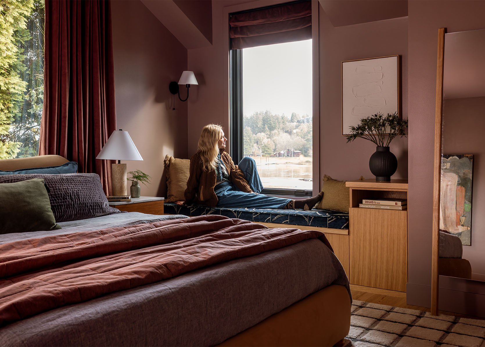 arquitecto, Anne erserdiseñar todas las habitaciones tienen segmentos de pared de banco, así que agregamos Esta hermosa tela Pollack Para las alfombras de banco: el azul oscuro se siente como una muy buena adición a todo el rosa cálido (utilizamos un esquema de color verde en el restaurante para poder volver a llamar).
