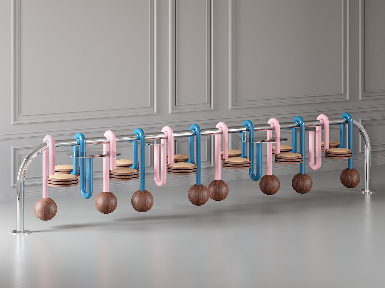 Asientos de barra pública con una serie de tubos rosados ​​y azules con discos de madera y esferas montadas en marcos de metal en paredes gris claro