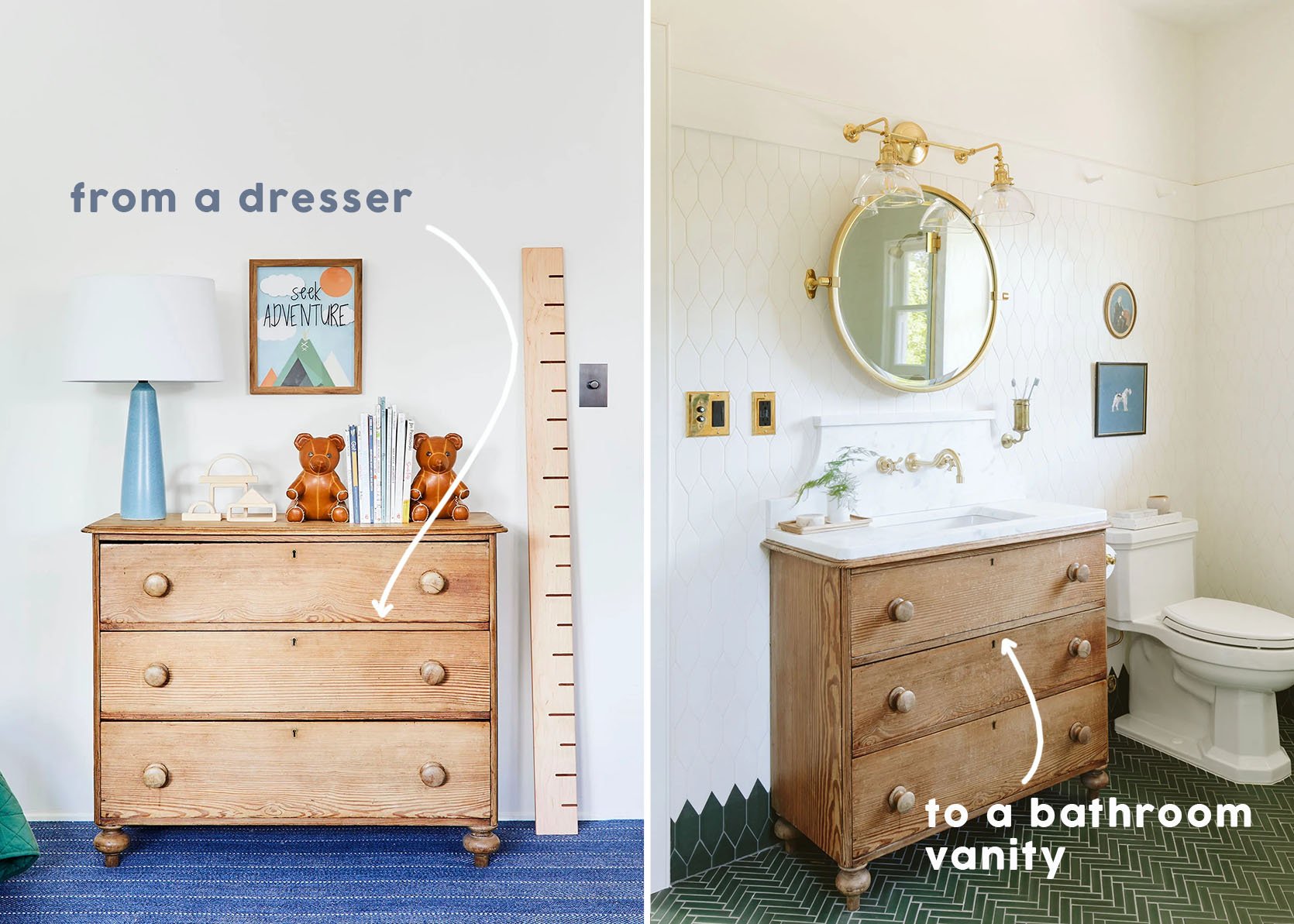 El baño de los niños es una vieja tocadora de pino en nuestra casa en Los Ángeles (y Casa de montaña) Aunque el fregadero es un poco poco profundo, funciona bien ya que tenemos un grifo de pared. Escribí un artículo sobre ¿Cómo nos convertimos aquí?.