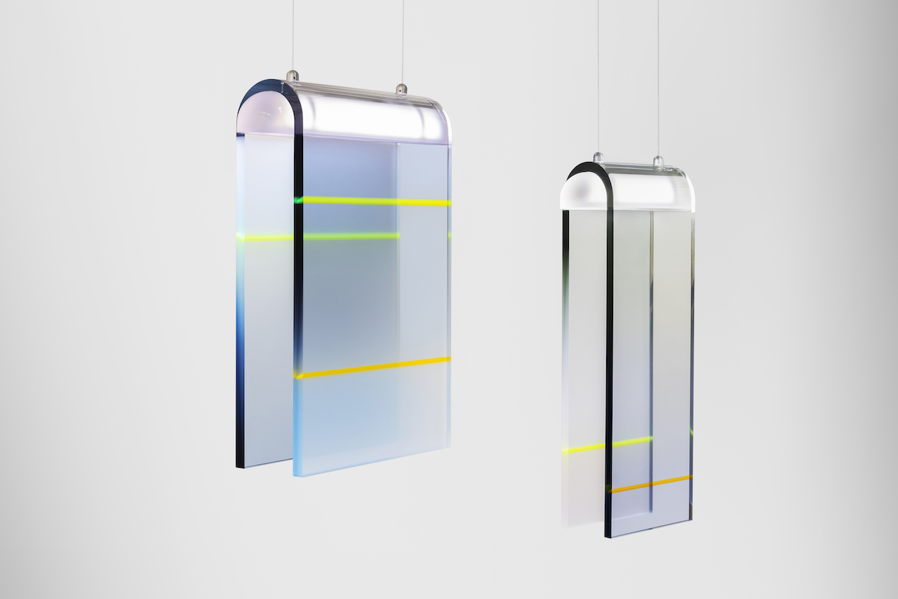 Los candelabros de cinta tienen una cinta curva de acrílico que cuelga elegantemente sobre las cápsulas de luz LED. Insertos opalinos y colores de neón vibrantes, que recuerdan a las vigas láser, colgadas en Lucite, captura para siempre la breve refracción de la luz que podemos encontrar en nuestra vida diaria por casualidad. Gracias a la calidad transparente del material, la luz de la cinta aparece en forma de dos superficies paralelas superpuestas, proporcionando una experiencia que varía según su perspectiva. La interacción del color, la luz y el material van más allá de la función utilitaria del espacio de iluminación, un efecto más cercano al arte en la galería.