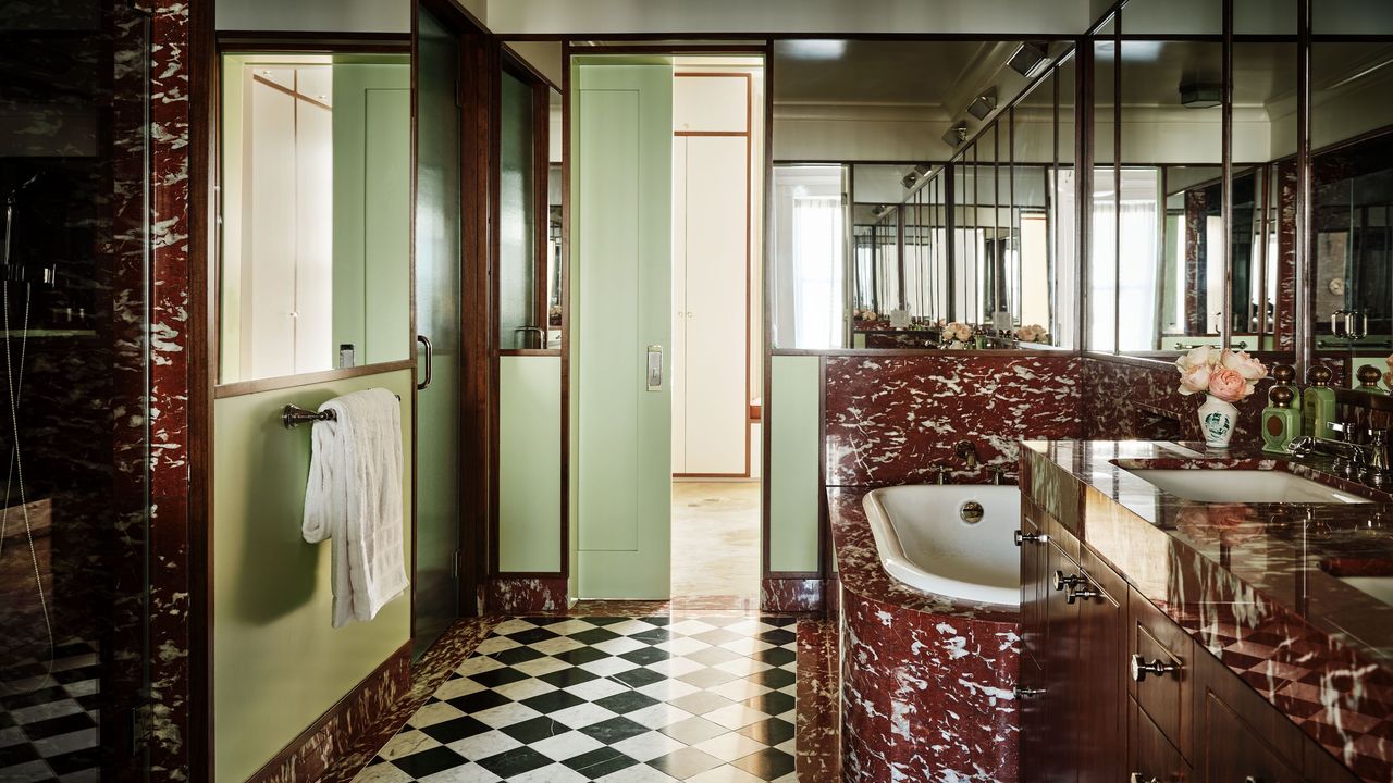En el mercado, esta combinación de colores encuentra especial relevancia en el baño, las encimeras, el hardware y más están jugando dramas. Por ejemplo, el nuevo grifo azul de Kallista tiene un mango de piedra verde, mientras que Emtek hace su debut con la palanca Rosso Levanto en su línea de hardware de gabinete seleccionada. Recientemente se expandió a muebles ann sacks en Kbis Este año, hay una tela de vaca rica que se destaca de la entrada a Milán. En el impresionante baño principal de Elsesser, vemos un aspecto redecorado para el mayor impacto, con losas de mármol Red Rosso Francia combinadas con fábrica de nogal y Pistacho Pistacho Benjamin Moore. «El rojo y el verde son una combinación de tradición, pero también clásicas, y trae este sentimiento histórico», explicó Hod.