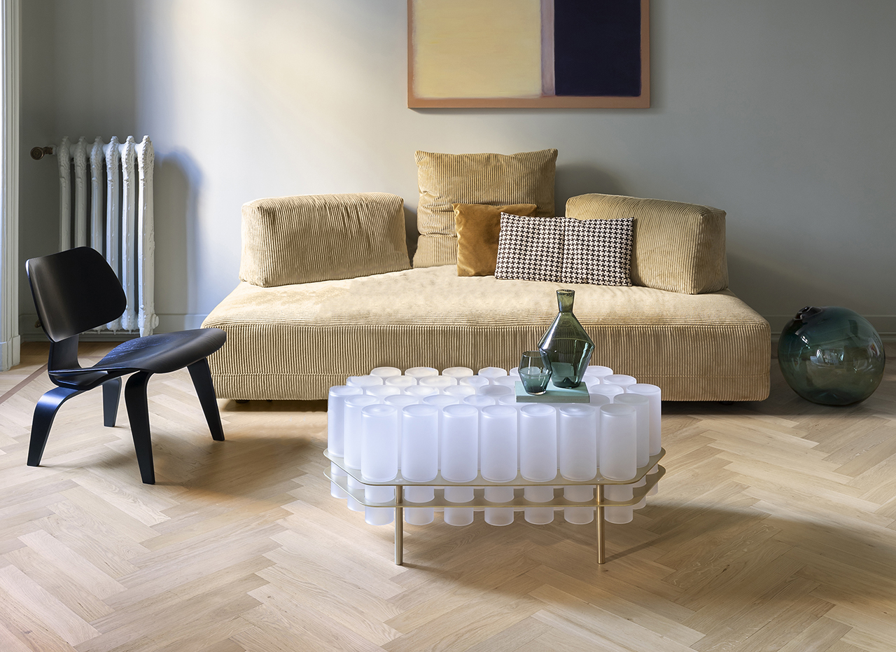 Los grupos de elementos de vidrio están colgados en el espacio por un soporte de latón de placas de doble capa, todos los elementos de vidrio se fijan a las tres patas. La proporción es con sitio Tabla, módulos circulares repetidos unidos para formar la parte superior extruida. Existen muchas limitaciones inherentes de vidrio escrito a mano, pero Sklo ha revertido el problema de tamaño: el mismo módulo se puede usar en muchas iteraciones, incluida la creación de tablas de acento (campo 7), mesas laterales (campo 19) y mesas de café (campo 39).
