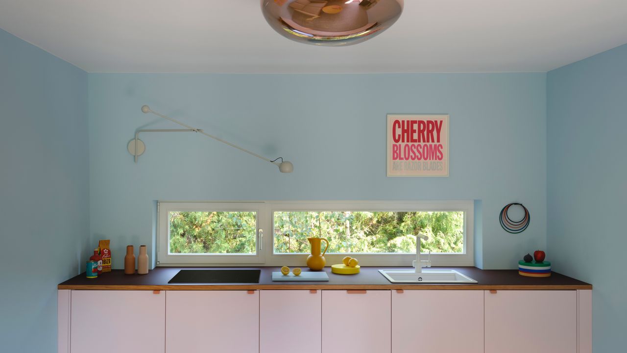 El techo exterior de la humilde cabaña es de blanco puro. Pero, entra y baila a la luz. Las paredes azules y amarillas brillan, los gabinetes de cocina son rosas, las encimeras de trabajo son berenjenas y las baldosas de baño son carmesí. Winkelmanns los combina con el instinto sólido e intrépido de colores, evoca atmósferas de verano interminables, no es una pequeña hazaña dada el infame clima impredecible y a menudo gris de Brandenburg. Gracias a una inteligente reorganización del plano de planta y el diseño de la habitación, esta cabaña de 300 pies cuadrados se siente espacioso. La entrada conduce directamente a la sala de estar con la cocina, y luego al dormitorio con la pared de dormir y el baño. La pareja usó algunos consejos para maximizar el espacio que tenían que usar, incluida la extensión del contador debajo del alféizar de la ventana para que no necesiten una mesa de comedor separada. Se agregó una ventana extra ancha a la pared sobre la instalación de la cocina, lo que inundó la luz, ya que hace que la habitación se vea más grande de lo que realmente es.