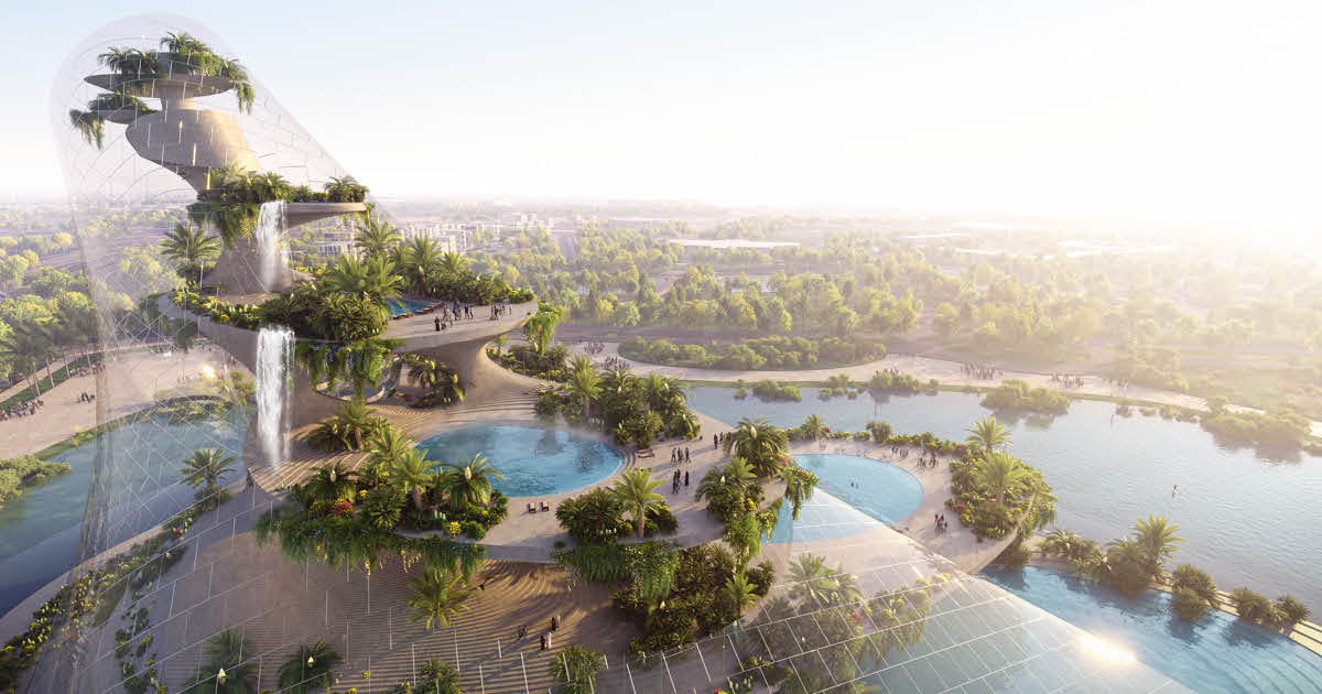 Situado en Zabeel Park al lado del Palacio Real en el corazón de la ciudad, Therme Dubai combina sin problemas las formas orgánicas con su entorno urbano circundante. El complejo de salud de 100 metros de altura presenta estructuras apiladas en forma de terraza circular, cada una decorada con una piscina, exuberante vegetación y cascadas. La visualización muestra los lagos sinuosos alrededor del edificio, mientras que la fachada transparente reduce la separación entre su interior y exterior.