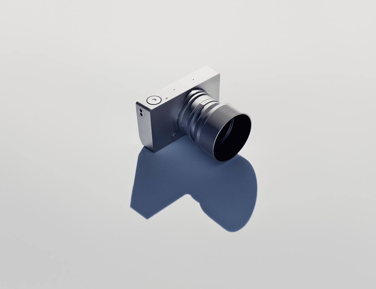 Tres cámaras digitales con lentes intercambiables, incluida la versátil Sigma BF, están dispuestas en superficies puras, con una iluminación suave que funden sombras suaves.