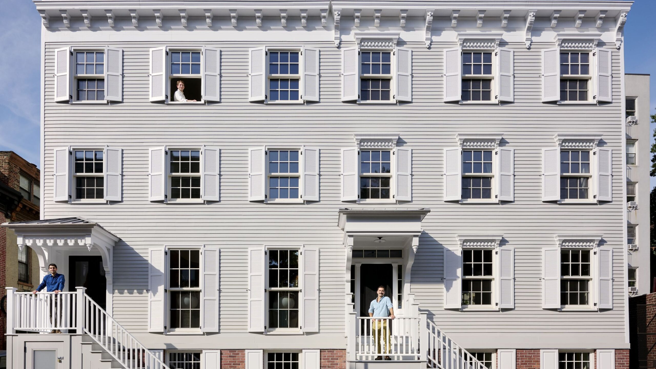 Trabajando en estrecha colaboración con los constructores maestros Mark Ellison y Adam Marelli, Grt restauró el edificio peligroso (regando nuevos cimientos, colocando marcos de madera) mientras adaptaba el interior a la vida contemporánea de ambas familias. En el exterior, esto significa devolver las decoraciones exteriores a su estado más temprano conocido, reconstruir persianas, dinteles, cornisas, pistas, etc. para que coincidan con las fotos de 1940 en alrededor de 1940, y hay un cambio inteligente entre las dos direcciones. «A nuestra práctica le gusta interactuar con edificios históricos», mehta sugiere proyectos anteriores como la conversión de la diócesis de Harlem. «Queremos hacer lo correcto a través de estos edificios».
