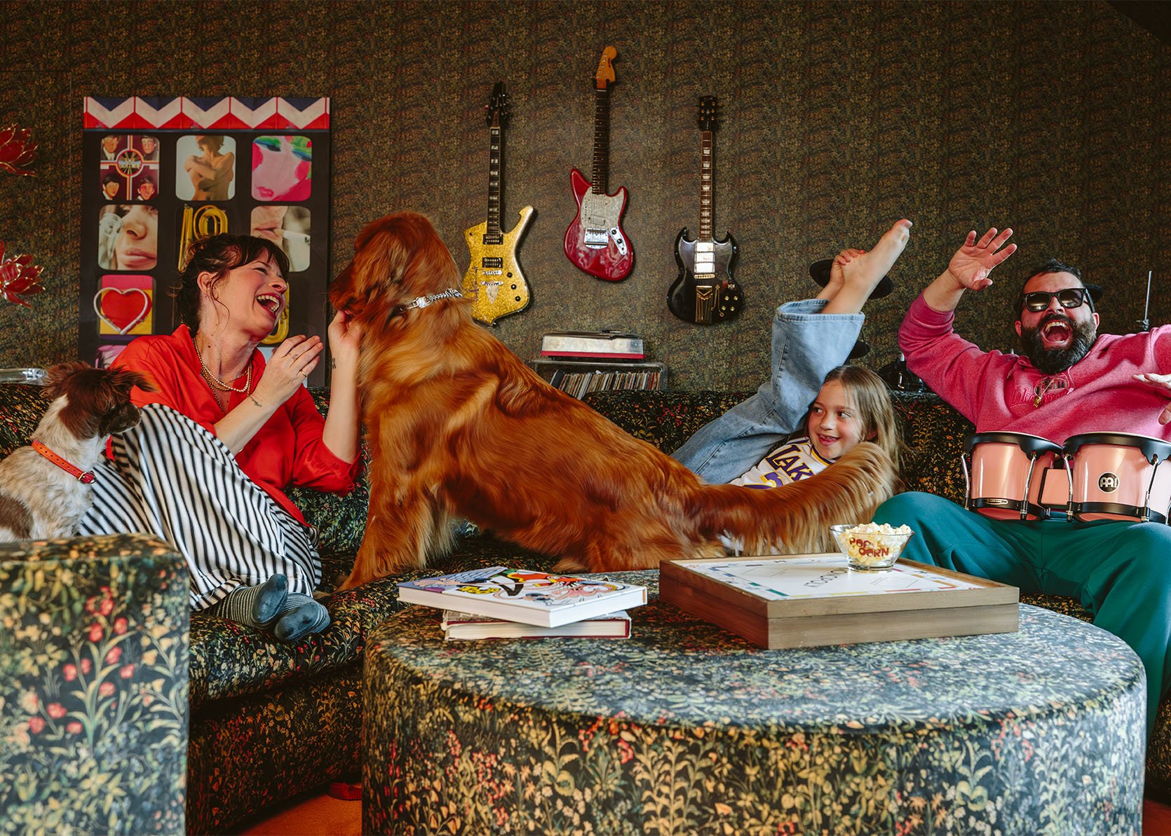 Amo a los amigos creativos y me alardeé sin parar – especialmente Esas valientes personas tienen más diseño que yo. Puedo estar muy seguro y muy preocupado por la «eternidad» (especialmente la finalización permanente) para ser amigos de aquellos que son naturalmente arriesgados, sin una segunda suposición de que sería muy divertido para mí. Así que hoy te muestro mis amigos Annie y la sala de bonificación de Derik con alfombras rosadas de pared a pared, fabricante de palomitas de maíz de la vieja escuela y Mismo patrón de tela de cuchara En sofá, paredes, cortinas, sillas de comedor antiguas y asientos de ventana. Demasiado loco. Esta es su hogar en el lago Toluca, donde ella y su esposo Derik Dbone Reckley (músico Mira su álbum aquí! ), Hija Violet de 11 años y tres cachorros. Annie reconstruye la casa con su pareja ASOM HOGAR (Por favor, síguelos). Durante la remodelación de un año, me dijo que estaba planeando empaparse del patrón con el mismo fondo de pantalla de Spoonflower y patrones de tela en toda la habitación, y casi ruego venir y disparar antes de una asociación con Spoonflower. Pero, prepárate para ver algunos riesgos que puedan sorprenderte, ¡como esa luz! ¡Me siento así por esa lámpara! (También lo es Tiktok, obviamente un descubrimiento del «Santo Grial». Para diseñar la habitación, realmente nos inclinamos hacia su estilo, que es muy rock, totalmente moderno, salvaje y altamente creativo. Saqué piezas de su casa, colgué guitarras y arte, y abrazé todo lo que los hizo a ellos. Color, retro, y en este caso, incluso un kitsch (¿puedes encontrar pinturas de terciopelo?)