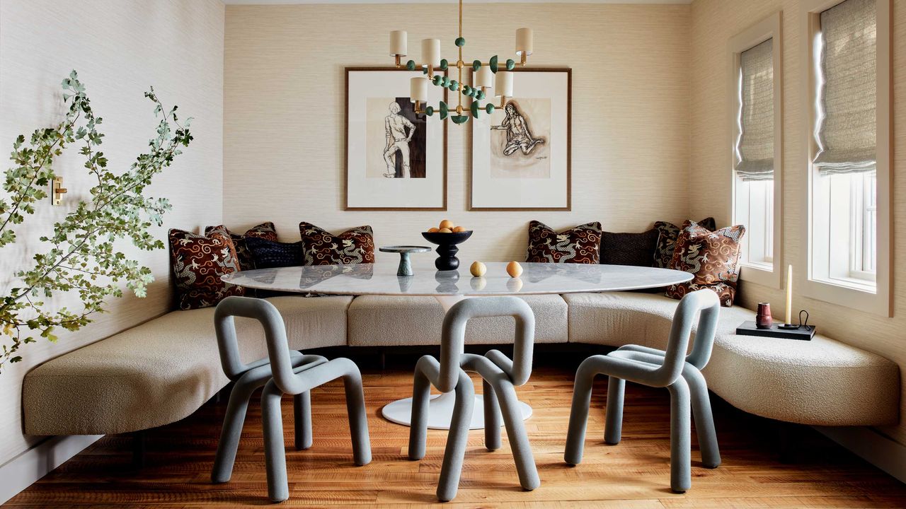 Este rincón de desayuno se encuentra en un extremo de la cocina en forma de L, que le da a Holmberg la oportunidad de crear este banquete integrado integrado. «Le encantan las formas lúdicas, las piernas redondas y las peculiaridades no lineales», dijo la diseñadora de la cliente Amy Furstenau. Con eso en mente, Holmberger se ha ido de barbacoincide con el banquete.