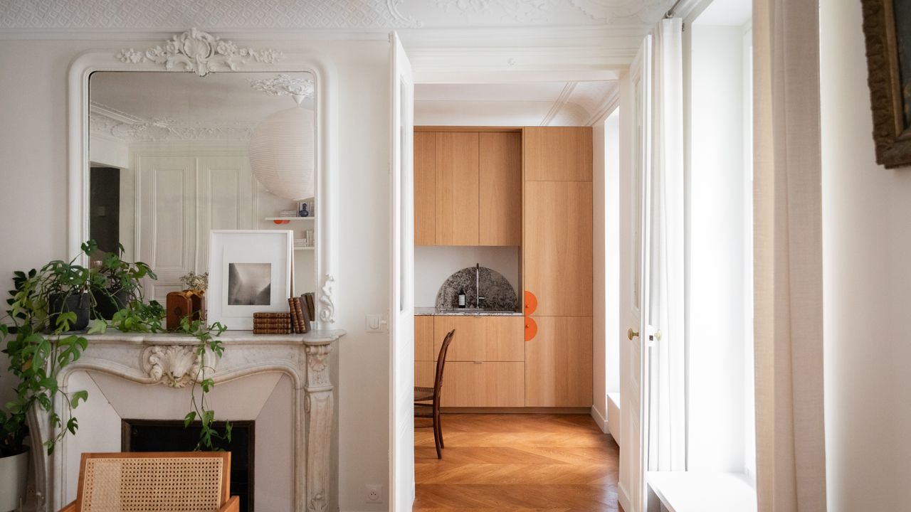 Uno de los principales desafíos de la transformación es acomodar algunas de las peculiaridades del diseño original de Haussmannian mientras hace que el apartamento sea contemporáneo y eficiente. Las tuberías están en un lado del dispositivo y requieren un pensamiento creativo para integrar nuevos dispositivos sin dañar la estética del espacio. El proyecto aprovecha los bucles existentes en la sala de estar al tiempo que elimina ciertos elementos para resaltar la profundidad visual de las habitaciones adyacentes. Los estantes abiertos integrados en la entrada mantienen esta espaciosa impresión mientras agregan un toque moderno.