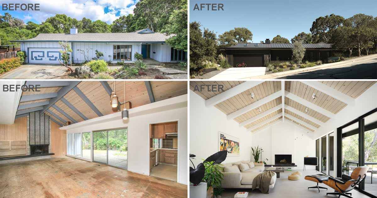 El revestimiento y los techos actualizados le dan a la casa una sensación elegante y moderna mientras mantiene una silueta de rancho bajo. En el patio delantero, las paredes y plantas bajas de concreto crean privacidad desde la calle y complementan las crujientes intervenciones modernas del edificio.