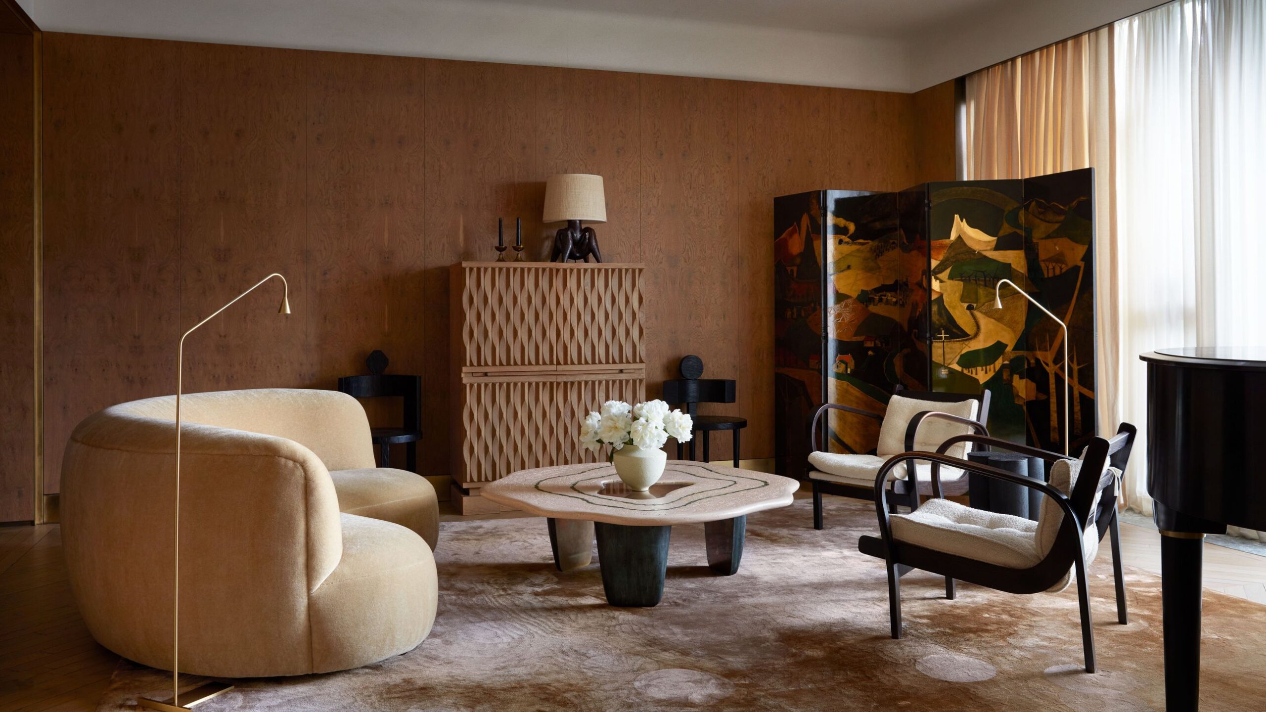 Hay una ocasión desde el momento en que entras y llegas a la sala de entrada. La expansiva sala de recepción presenta paneles de pared lacados carmesí y Galerie Diurne Carpet Studio Ko, diseñado por el patrón de archivo Gabrielle Chanel en pisos de roble francés. También es el flujo elegante de todo el espacio habitable, que progresa a lo largo del comedor, sus paneles de pared de muletas reflejados y franceses y mesas de comedor de mármol, así como un conjunto de sillas Pierre Jeanneret, a través del salón, a través de una serie de marcos de mármol de jade, a través del salón para llegar a la sala de música.