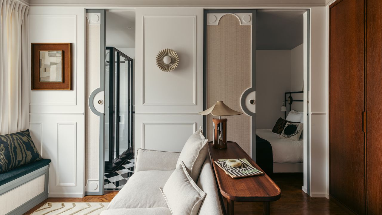 Cuando una pareja francesa que ahora vive en los Estados Unidos compró por primera vez la casa de 323 pies cuadrados, tenía una Plano de piso incómodo Según el diseñador de interiores Adeline Hemmonot. Ella y el curador de arte Ana Sirotdando la tarea de rediseñar completamente el espacio. Hémonot decidió reimaginar el apartamento compacto como una pequeña suite de hotel y tener todas las necesidades de la vida cotidiana en una decoración cálida y ligeramente parisina, sin ninguna prosperidad innecesaria. «Me concentro principalmente en separar la sala de estar (entrada, cocina y pequeña sala de estar) del dormitorio, accesible a través de puertas correderas, las paredes de la cama cuelgan en el baño, separadas por paredes de vidrio ranurado». Hemmonot hace transiciones entre los dos espacios en un estilo de teatro con puertas correderas anticuadas con detalles clásicos.