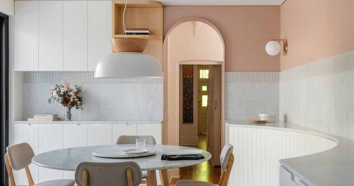 En este comedor moderno, los duraznos terrosos cubiertos con el centro de ayuda de la base de mosaicos y mantienen el espacio, mientras que la mesa de comedor redondeada de mármol de Jardan es el núcleo del espacio, mientras que las líneas de carpintería de paneles de madera curva son las paredes.