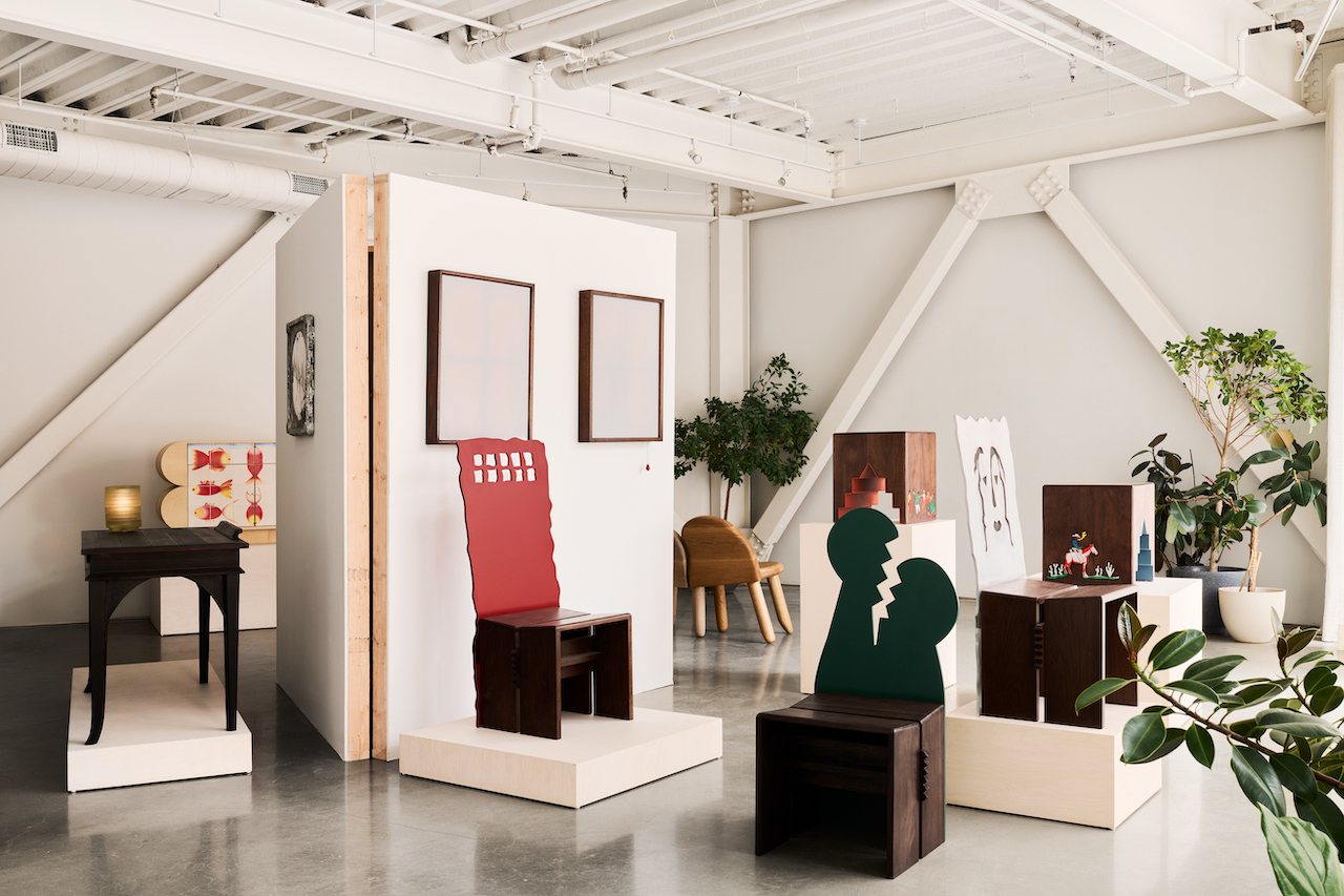 Moderno de espacio de la galería muebles de madera esculpidos que incluyen una silla blanca con recortes faciales y cajas de madera con coloridas figuras y formas pintadas