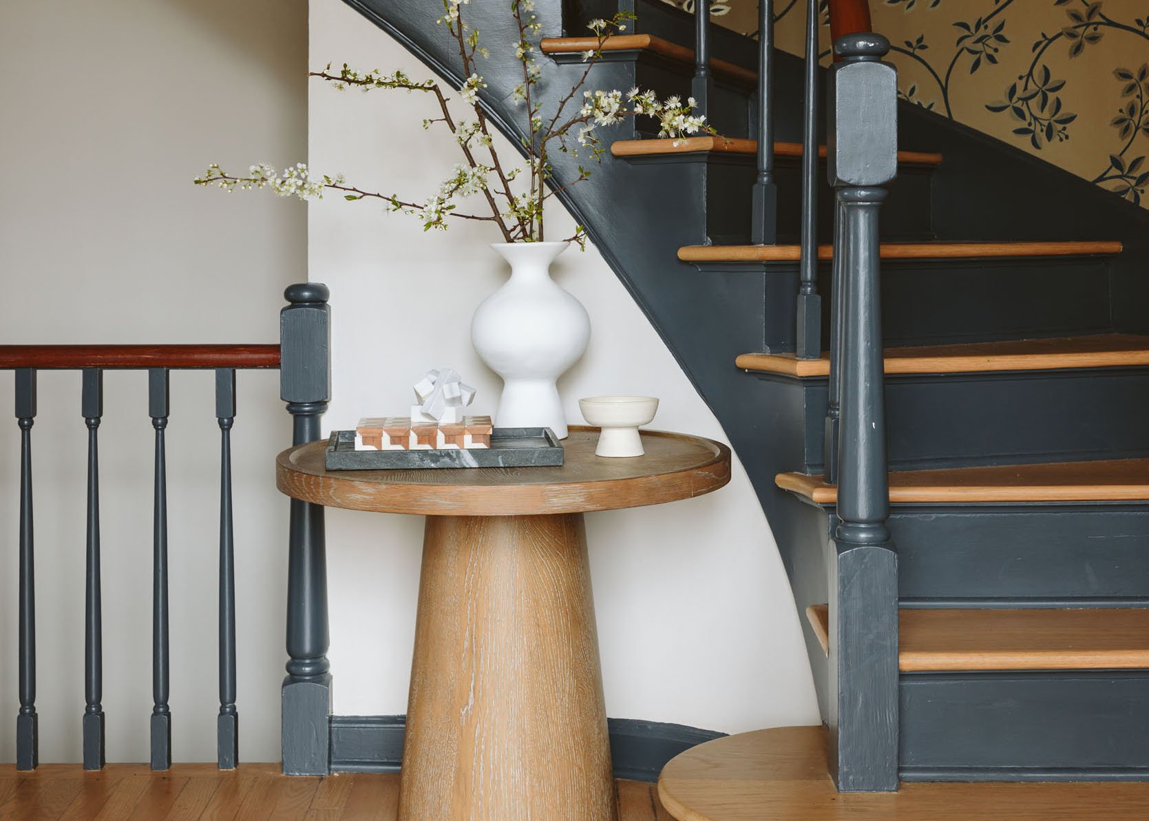 También quiero mostrar esta hermosa entrada que no la inserta en ninguna de las razones reveladas 🙂 La razón por la cual las tablas de pedestal son tan populares en la entrada (y por qué funcionan aquí) es porque el círculo está inherentemente para fluir (menos colisiones de cadera), mientras que la forma básica simple complementa todas las líneas de todas las barandillas de la escalera tradicionales. ¿Imagina si esta mesa es cuadrada o tiene tres o cuatro patas? ¡jadear! Las siluetas aerodinámicas contrastan bruscamente en este espacio ocupado (incluso sin ese lindo fondo de pantalla).