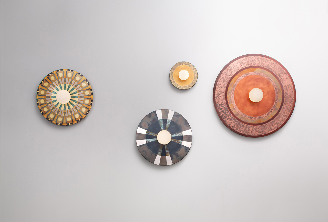 La oxidación del acero, el latón y el cobre y los pinceles crean una incrustación multicolor que se extiende a lo largo de la placa a medida que se aleja suavemente de las paredes, proporcionando una sensación de profundidad. Como la placa está ligeramente inclinada, menos luz alcanzará el borde y creará un gradiente elegante. Cuando la luz golpea la pared circundante, las sombras crean alrededor del plato, acentuando aún más la placa de metal. Una colección de núcleo brillante de la colección Caleide, que incluye tres patrones: Caleide Eon, Caleide EOS y Caleideèto, proporciona posibilidades metálicas visualmente interesantes pero totalmente refinadas.