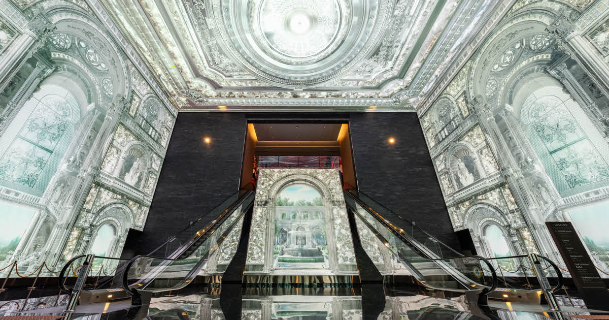existir Inspire Entertainment Resort En Incheon, Corea del Sur, un área de entrada llamada «Cube» se ha transformado en un palacio de cristal. Una vez dentro del cubo, los visitantes encontrarán pantallas LED inmersivas montadas en el techo y las paredes, cada una mostrando un interior decadente e iridiscente. este Instalar Con un impresionante nivel de detalle, magníficamente decorado en techos de cúpula, molduras de pared y arcos exquisitos. Aunque completamente hecha de pantallas planas y en interiores desplegados, la instalación del Palacio de Cristal todavía tiene una tridimensionalidad significativa. Parece que incluso si solo un momento, los turistas han sido enviados de regreso a 1851 a tiempo.
