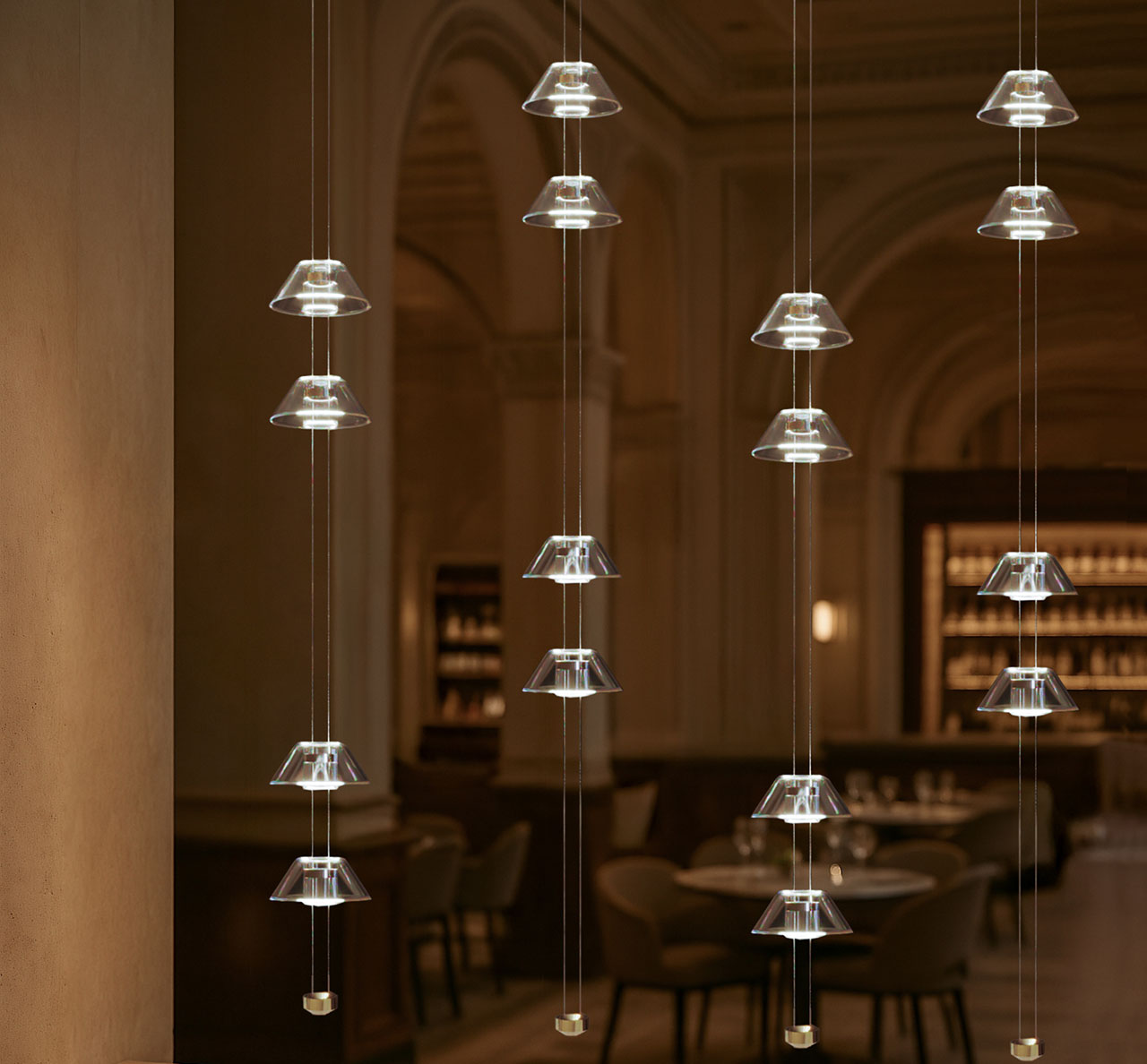 Un ángulo específico crea una luz cálida que convence el haz en una configuración predeterminada. Esto crea un brillo agradable que muestra una verdadera maravilla en una configuración tan grande de Salone del Mobile este año.