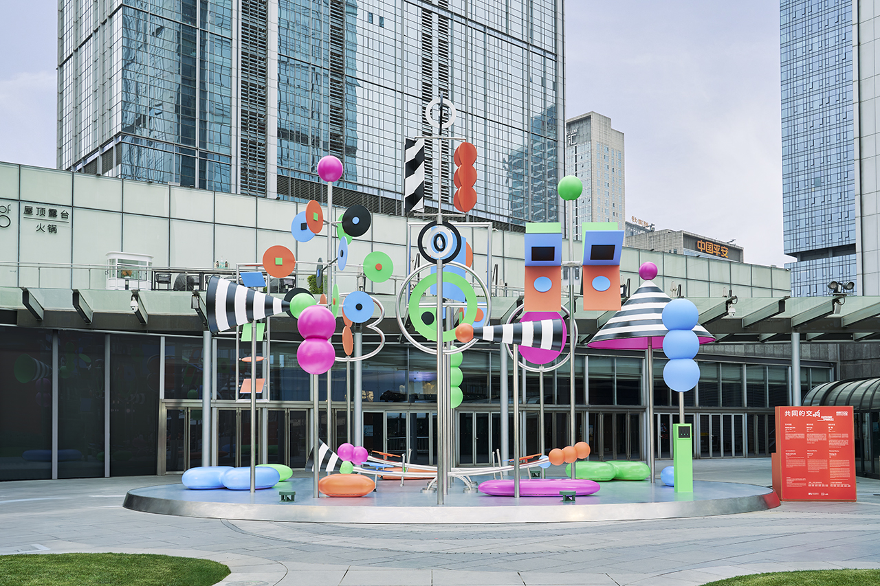 Las rayas en negrita, los tonos impresionantes de magenta y naranja, y las capas verdes y azules caprichosas salpican el cuadrado, las esculturas dinámicas se torcen felizmente en el espacio. Esta sensación de energía refleja las concurridas calles Chengdu, justo debajo de la instalación, si los techos de Chengdu parecen estar lejos de las vastas y relativamente tranquilas calles.