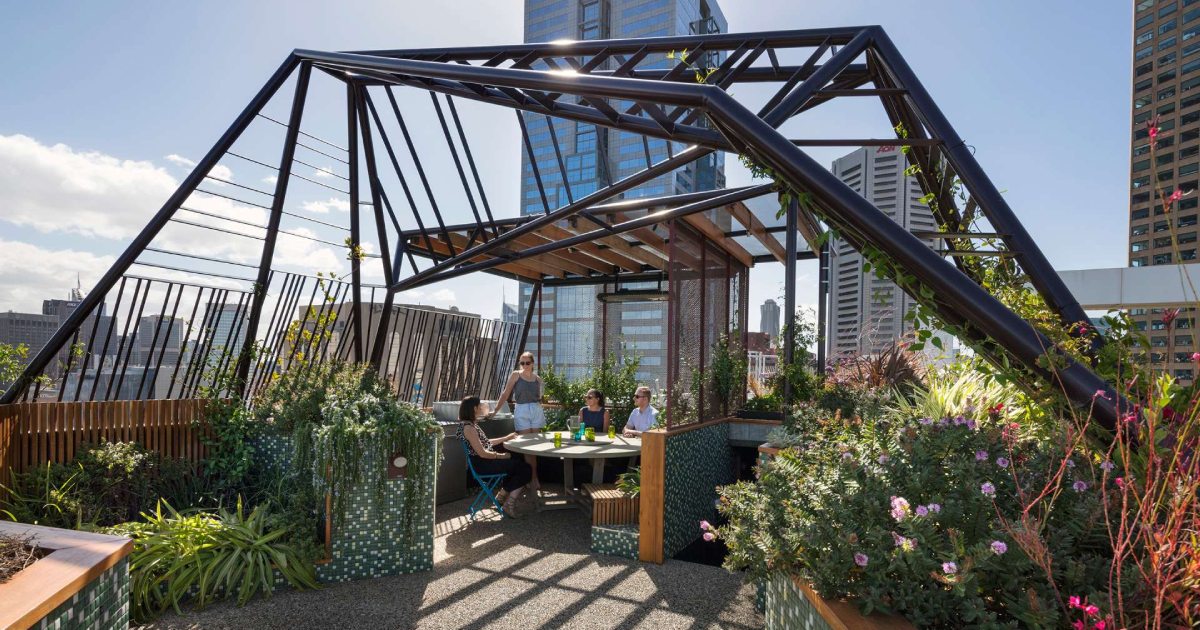 Un cenador de acero escultural forma el jardín de techos de Phoenix en el centro de la ciudad de Melbourne, lanzando sombras dinámicas en un patio de mosaico. El espacio combina la plantación exuberante, las baldosas personalizadas y las áreas de asientos definidas para crear un jardín habitable de 30 pisos sobre la ciudad. Este retiro de techo muestra cómo la estructura y la vegetación funcionan juntas en un diseño al aire libre de gran altura.
