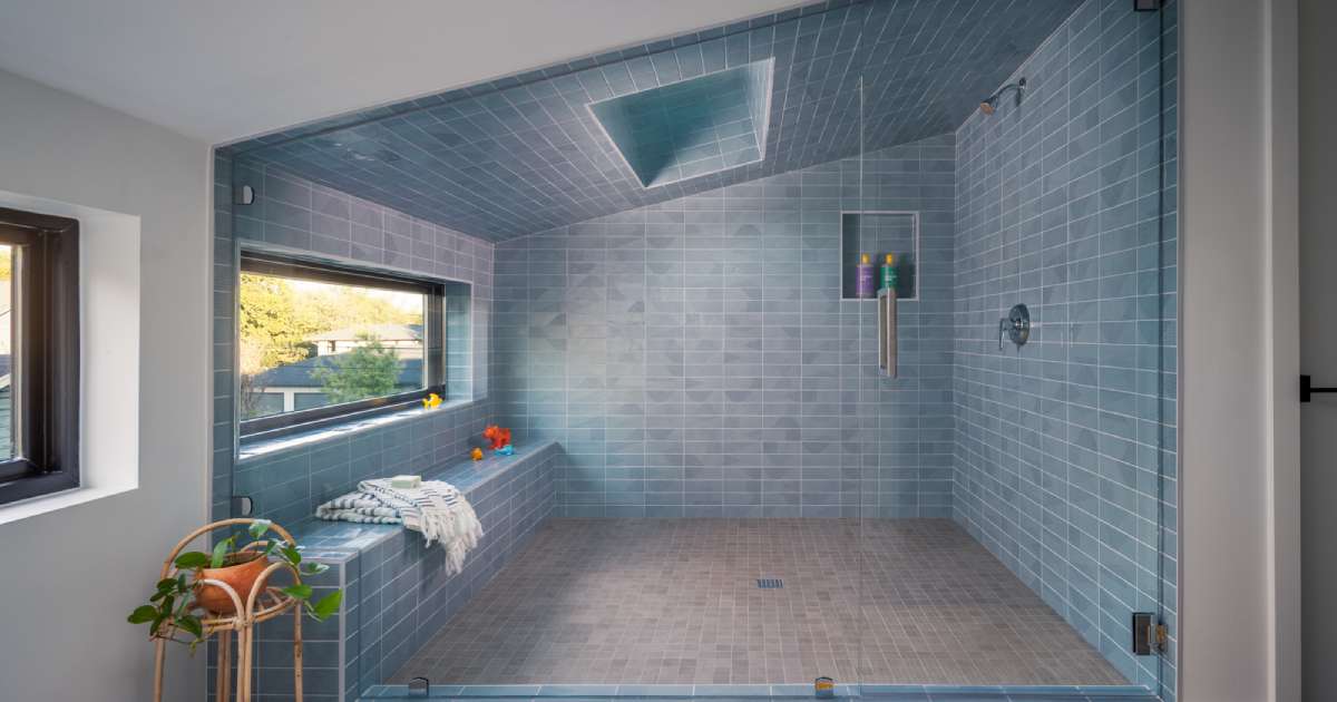 El nicho integrado está perfectamente integrado en la pared del mosaico, proporcionando una solución de almacenamiento sutil para jabón y elementos esenciales sin interrumpir el ritmo visual de la habitación. La luz de las ventanas y los tragaluces se extiende por cada superficie, y a medida que cambia el día, los azulejos azules se mueven de la tabla ahumada al azul del cielo.