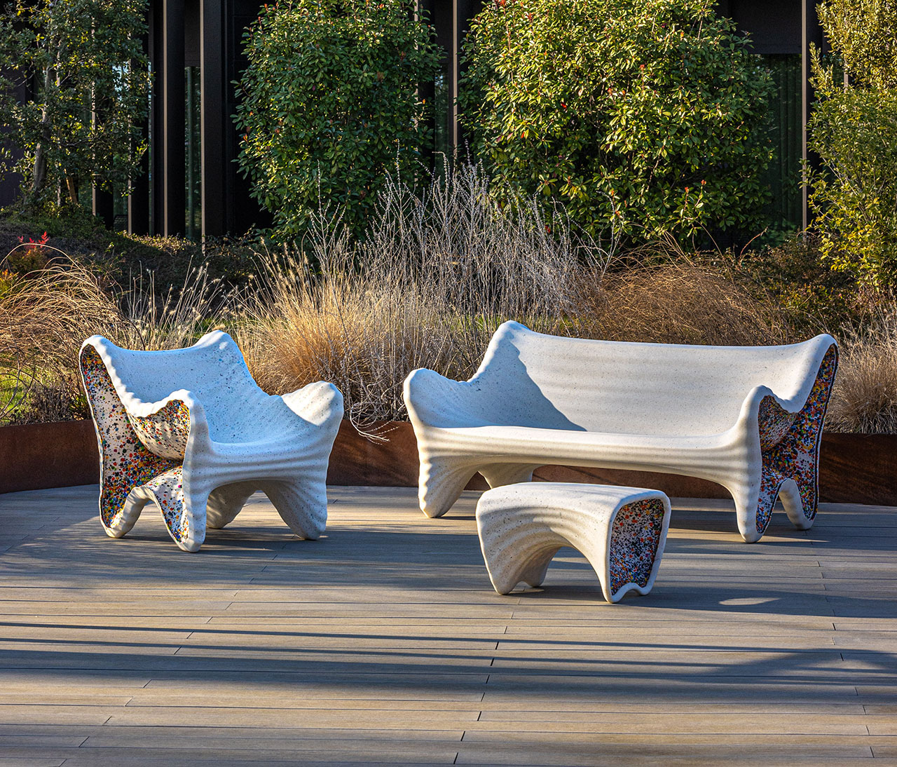 Las manchas ganan tracción en el interior de la silla, agregando un color de confeti a la suave y suave paleta exterior de salvia, blanca y terracota. La serie tiene sillón,,,,, sofáy Mesa bajatodos los cuales son para uso al aire libre. Las formas orgánicas dominan, no hacen ningún reclamo en el entorno natural, sino que se integran en él, agregando interés y elegancia a cualquier paisaje.