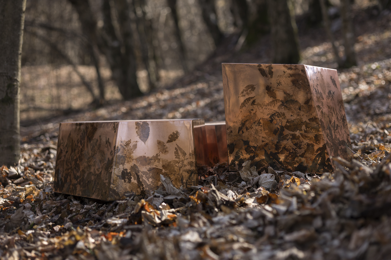 Continuando con el diálogo entre la naturaleza y la materia, la forma de cada tabla hace eco de la estructura prismática de los minerales metálicos, sus contornos irregulares evocan formas en el fondo de la tierra. En el suelo del bosque, cubierto por el patrón de hojas, la mesa parece que ha sido resistida allí durante años.