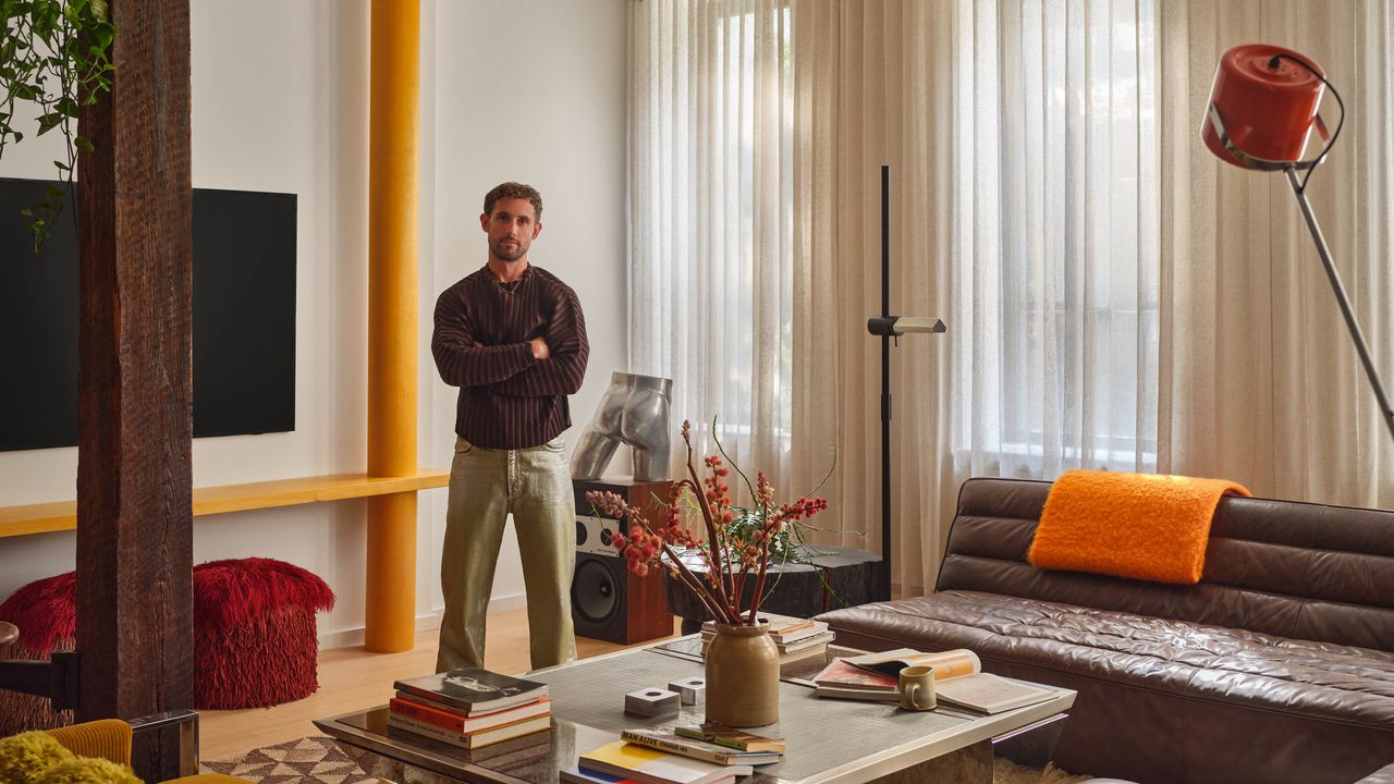 Allí, bajo las vigas de madera originales (una característica que llamó la atención del propietario durante la búsqueda de apartamentos), se suspende la vasta gama. Basta de asiento, rodeado por un sofá curvo de cuero Timothy Oulton, sillón vintage de Milo Baughman con pana de mostaza y almohadas, «Se siente como un agujero negro que te chupa», dice Driessen: «Y te hace querer estar cómodo, relajarte y relajarte y levantar los pies». El área de comedor aireado y sus antiguas mesas de madera están rodeadas de sillas de Stam de Mart bajo un colgante suave, que es una lámina simplificada para el área de felpa a su lado. Las dos habitaciones de la residencia se usan para maximizar la paz y la comodidad con colores terrosos y obras de arte personal.