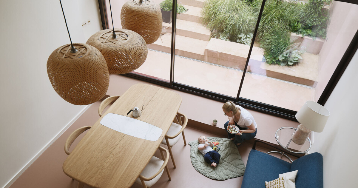 Sobre la cocina, el mezzanine loft glaseado proporciona un retiro tranquilo y elevado mientras mantiene una conexión visual con el resto de la casa. La ubicación pasa por alto el área residencial de doble altura, lo que permite que la luz pase libremente, lo que mejora la sensación de apertura. Este espacio suspendido se puede usar como esquina de lectura, área de trabajo o salón