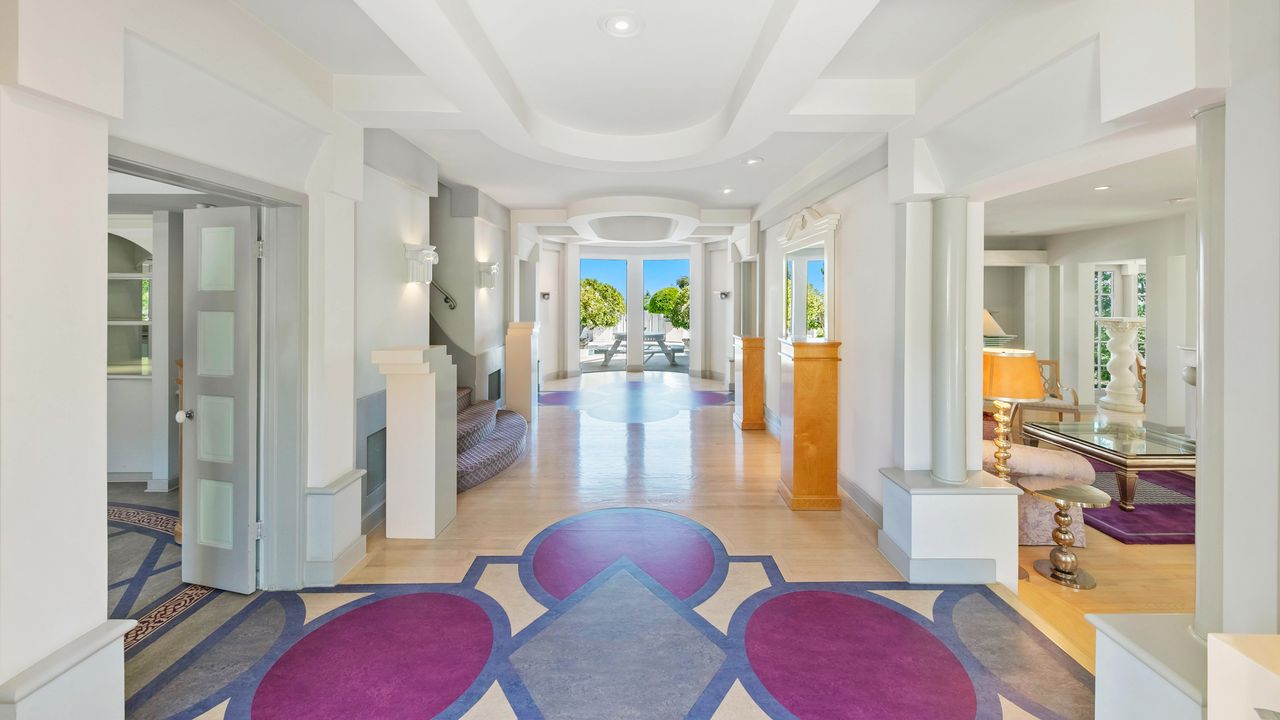 La columna solemne más allá de la residencia, el sol está brillando Entrada Saluda al invitado con una línea de visión directa Terrazase puede acceder a través de puertas de vidrio de piso a techo. Los huesos seguramente están allí, aunque puede haber algunas actualizaciones para los compradores de la casa, dependiendo de su gusto. El espíritu estético retro de los 80 ha estado en toda la casa, desde incrustados en pisos de madera hasta pisos de madera y escaleras de alfombras sinuosas forradas con murales de ángeles, pasamanos esféricos y cromados de metal.
