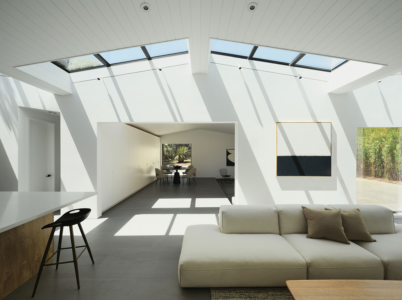 Agregar dimensiones a la huella moderada es un techo único al estilo de acordeón, una interpretación moderna de los gangles tradicionales, tallados en picos dinámicos y valles. Desglosa las amplias proporciones de la unidad, agrega el ritmo visual y permite que la luz del día pase a través de una fila de tragaluces que se alinean con los caminos principales de la casa, desde la entrada hasta la sala de estar hasta la cocina.