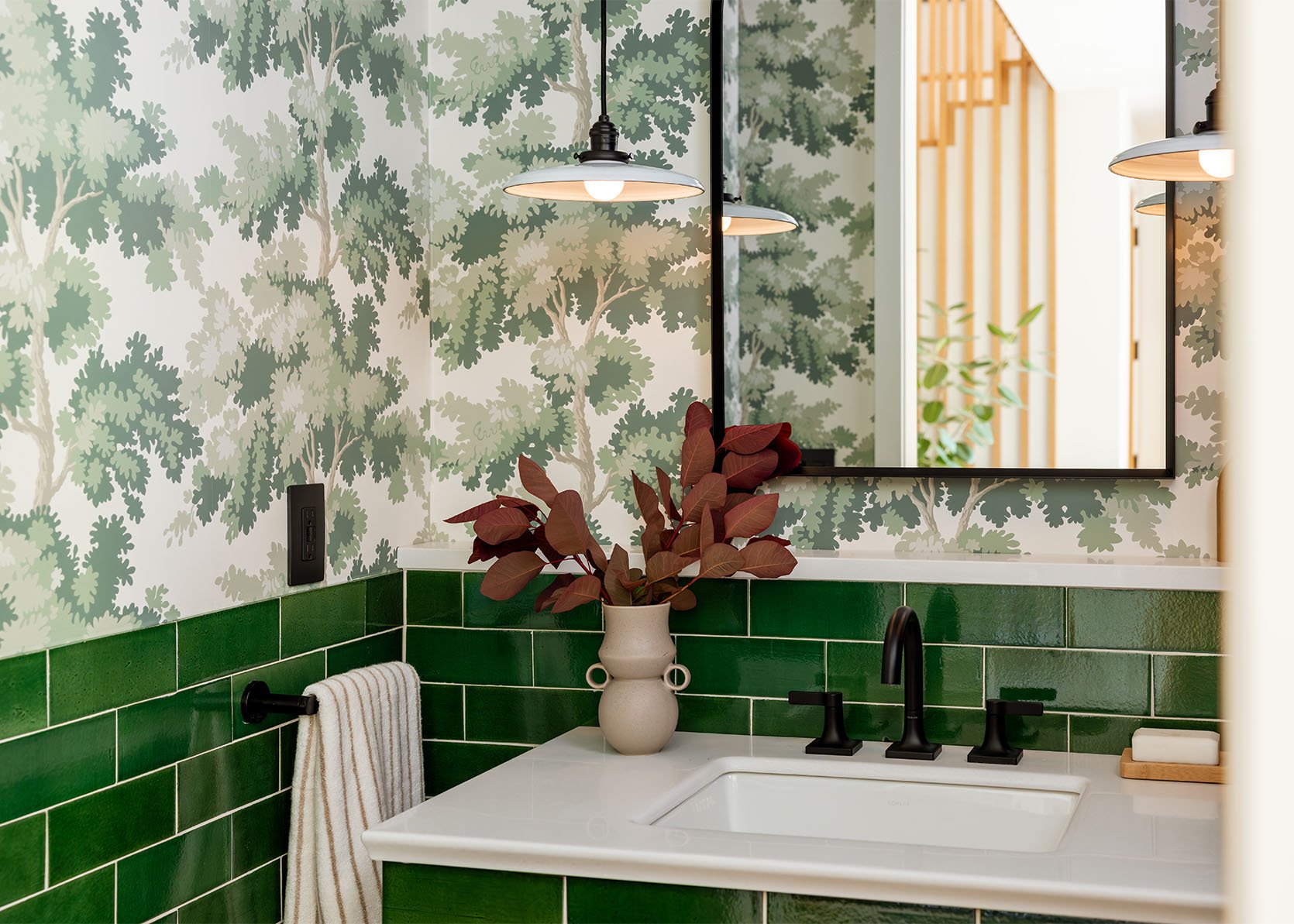 Este baño es grande para los baños de polvo y la oscuridad (sin luz natural), solo la pintura se siente un poco muerta, por lo que nuevamente me encargué de encontrar papel tapiz orgánico y fluido para contrastar con baldosas de ladrillo lineales, pero no demasiado tradicional en comparación con la mayoría de las flores. Como sabes, soy un gran fan Modo Raphael Por esta razón exacta: tiene este hermoso movimiento sin estar demasiado ocupado o audaz. Su gran escala con baldosas más pequeñas es muy buena, y la lechada blanca se tira bien contra un fondo blanco. Para mí, también se siente muy Oregon-Tree, etc. Sí, hemos visto mucho en estos días, pero me encanta verlo cada vez.