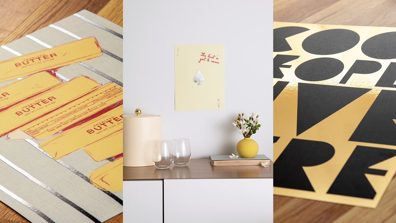 De $ 45 a $ 55, Ocho estampados de arte en la cápsula Diseños con marcos, estos diseños son brillantes y cuentan con detalles de aluminio plateado y dorado. Aparece en un fondo rayado Ilustración de mantequilla En la mesa Escena de «cena de niña caliente». Brilla en ostras abiertas y leopardos estirados. Donde sea que aparezca la lámina, agrega un punto de inflexión dorado al arte.