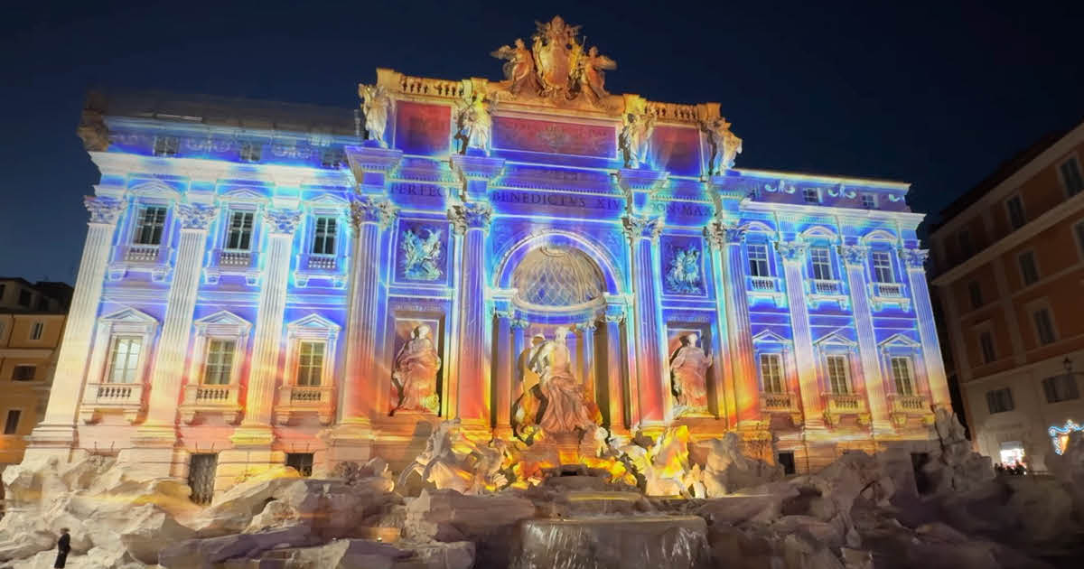 La fuente Trevi de Roma se transforma en un espectáculo de luces pintadas