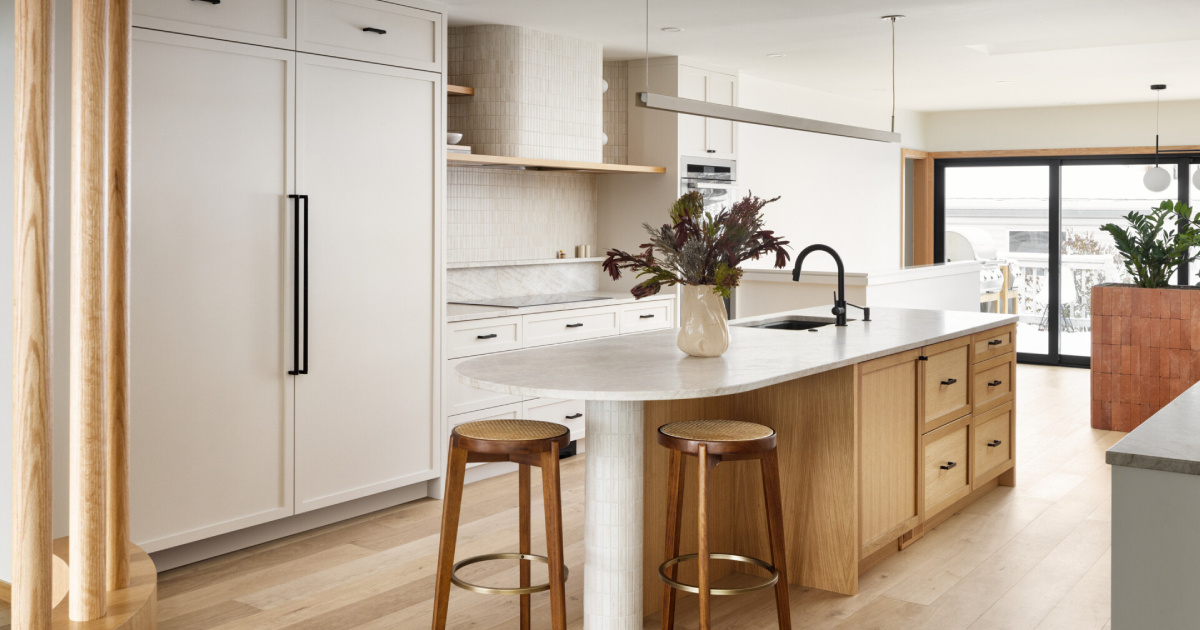 En el corazón de esta casa se encuentra la cocina rediseñada, una gran mejora a su valla original de la década de 1960. Mera Studio abre espacio usando gabinetes y encimeras neutrales para reflejar la luz y extender la visión. Las islas cálidas de madera se mezclan en pisos de madera, alentando el flujo visual natural a las ventanas traseras. Los ventiladores de capucha curvos y los mostradores de la isla suavizan los bordes típicos de los detalles de la cocina y continúan usando el lenguaje curvo de la casa.