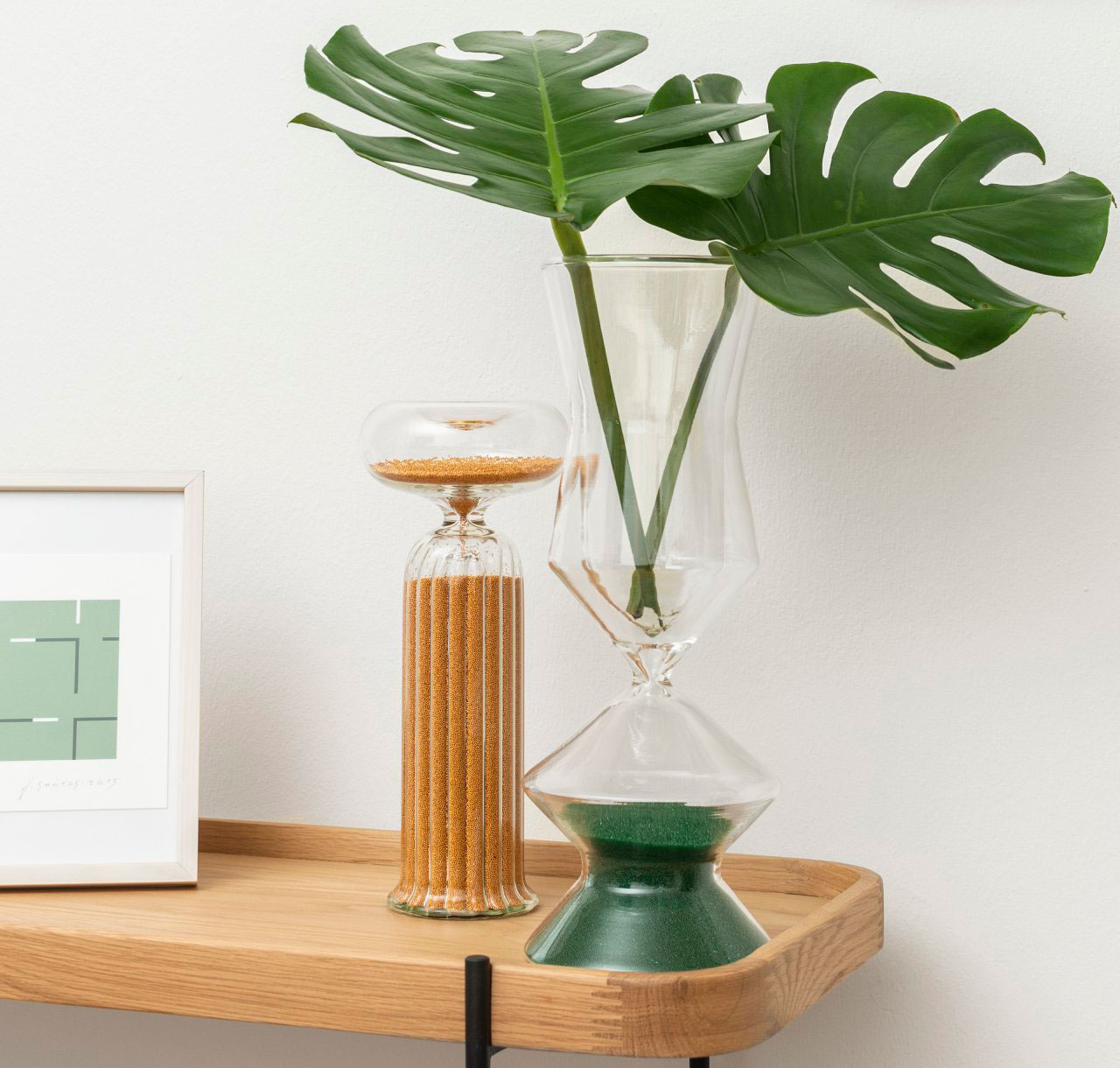Cada reloj de arena se sopla a mano en un taller en Suiza. El desarrollo es trabajar con fabricantes de vidrio para probar su gama de conocimientos.