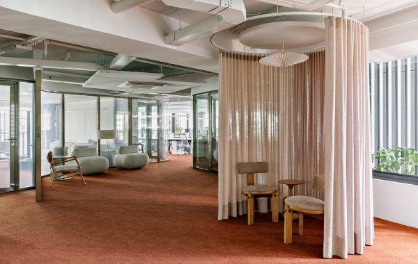 Custom Mill Factory enriquece las oficinas de la casa de Floydenberg, y su hijo Wolf está recién secado por la natación. La mesa de nido de piedra, las sillas laterales y las sillas de salón son retro. Akari luces Trabajo de arte de Isamu Noguchi y Claire Watson.