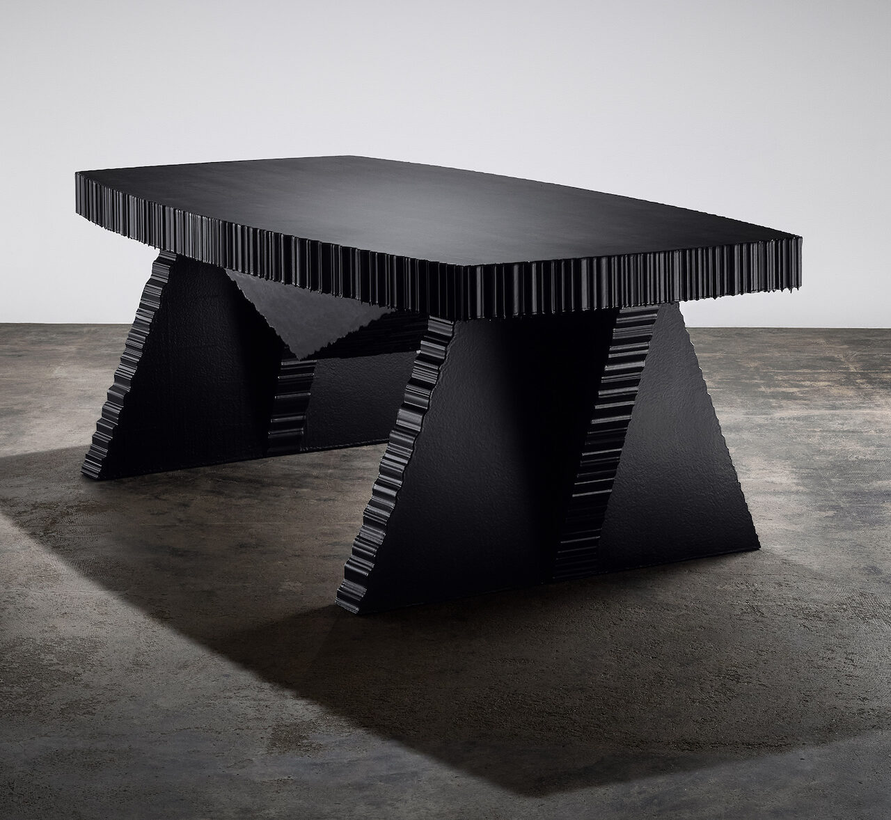 Cuando miras de cerca, la mesa pulida a mano revela irregularidades sutiles que te recuerdan el grano de madera, lo que te hace olvidar que la mesa está hecha de espuma de poliestireno. La homogeneidad de superficie y borde pulido plano, todo creado manualmente, crea yuxtaposiciones de textura perfectas, todas agregando calidez y toque a la forma futurista del trabajo.