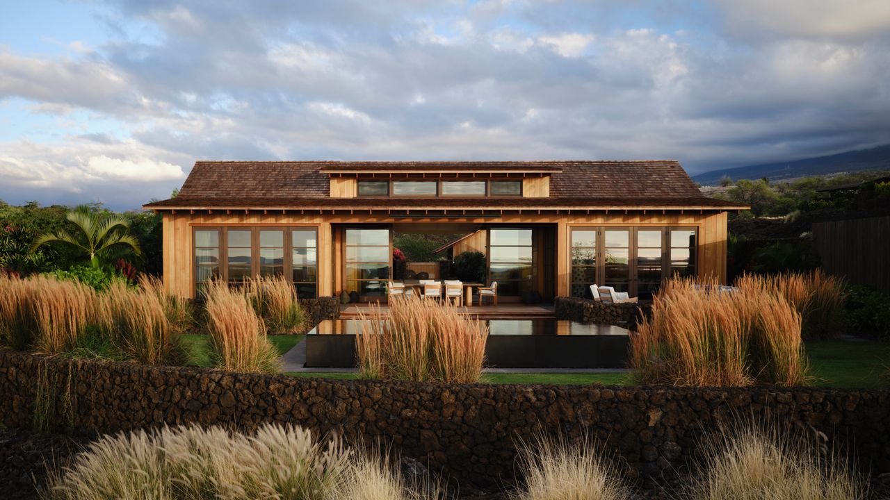«Criamos judíos con hijos, somos una familia judía, hacemos todas las tradiciones judías, pero cuando hablas de espiritualidad, la espiritualidad hawaiana es más importante», dijo la espiritualidad hawaiana. «Jim y yo realmente creemos». La entrada a la cabaña es una piedra volcánica hawaiana de origen local que se mezcla con el paisaje Sillón de lámpara de frau sparkler y escultura de acero Corten.