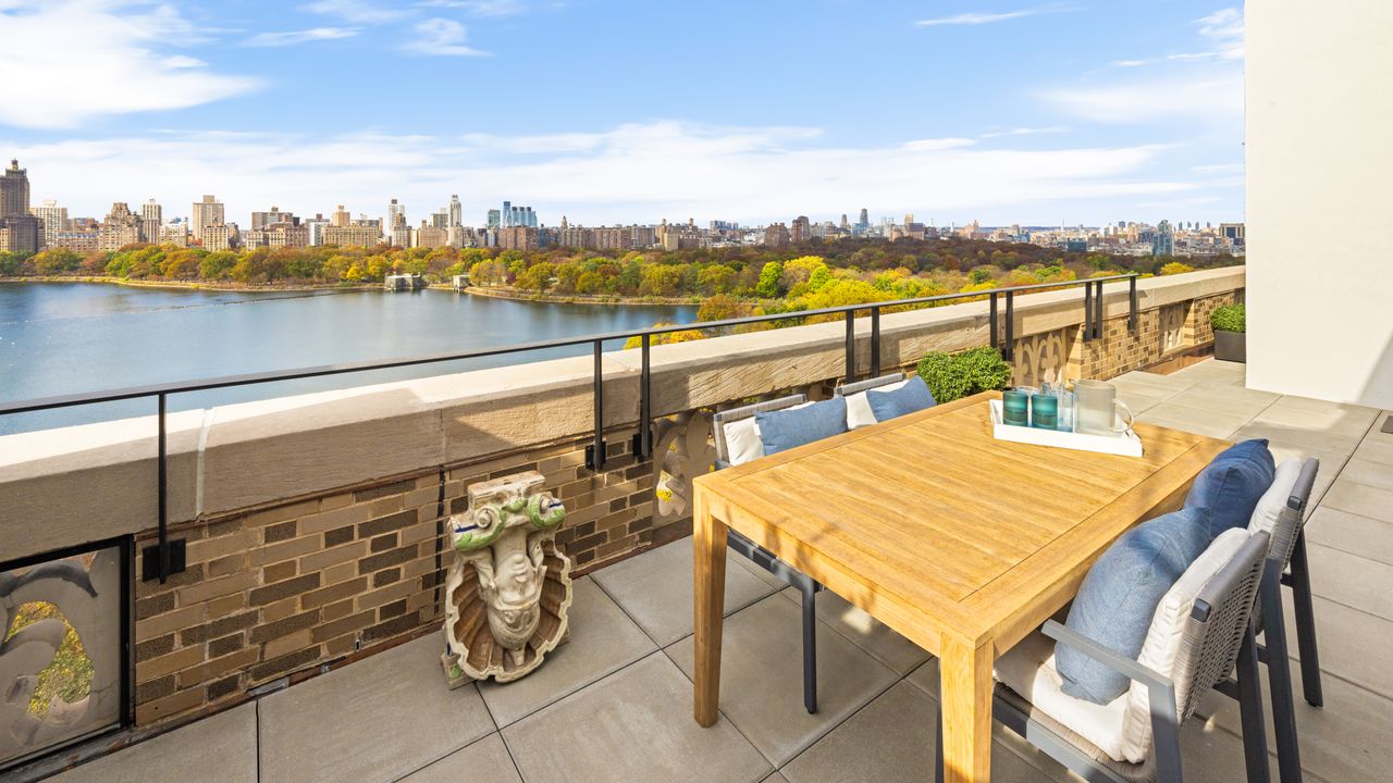 El ático incluye la mitad superior de la estructura construida en 1925, conservando algunos de sus encantadores detalles originales, incluidos pisos de espiga, estilo y incorporado. Newman y WoodwardLas baldosas florales de la década de 1980 siguen siendo uno de los dos baños y medio de la casa. Un ascensor privado se abre a un gran vestíbulo que ofrece acceso a la sala de estar, la biblioteca y el comedor formal. Este último está forrado con revestimiento de madera de cerezo y almacenamiento incorporado, flanqueado por bancos de ventanas. Para una cena más informal, la sala de desayuno se encuentra en un extremo de la cocina y tiene acceso a una terraza con vistas al embalse.